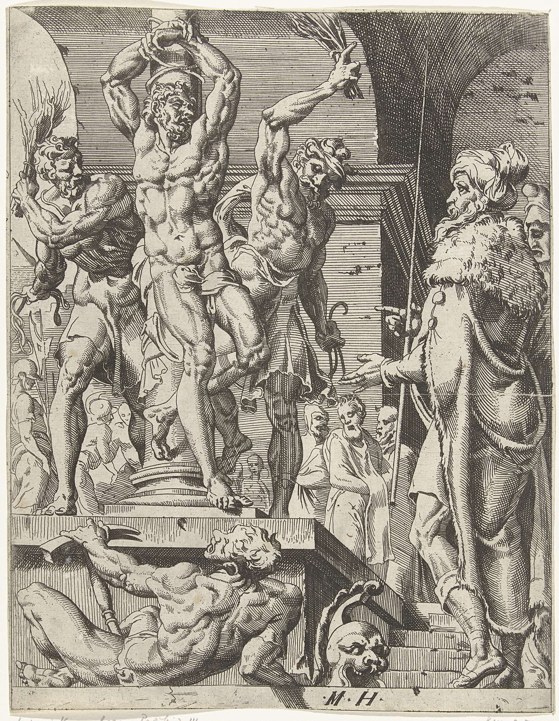 Christus, vastgebonden aan een pilaar, wordt door soldaten gegeseld. Pilatus staat rechts in de hoek en kijkt naar de marteling. De prent is deel van een dertigdelige serie met prenten over de zondeval en Christus' passie.