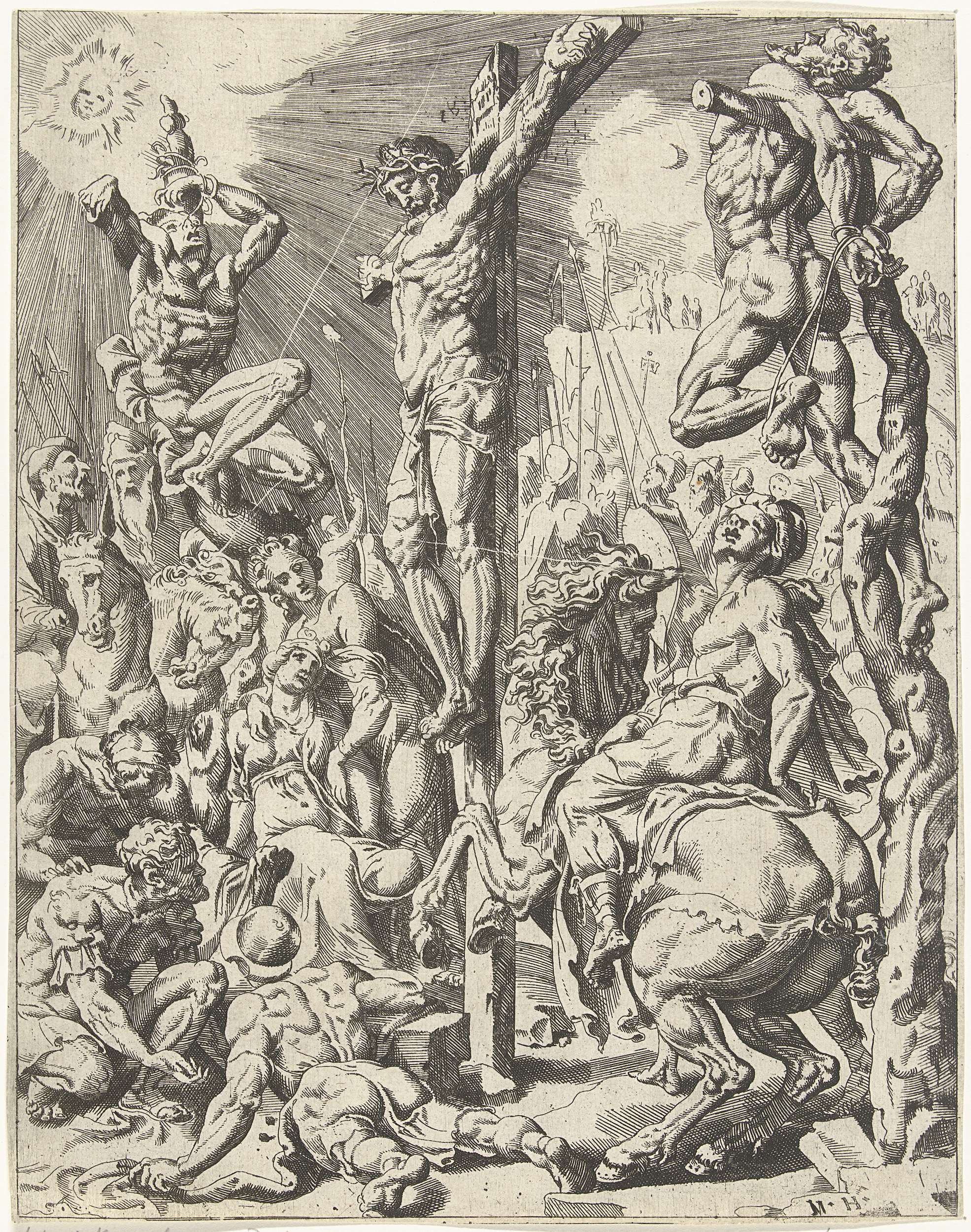 Christus hangt op het kruis, naast hem de twee misdadigers. Onder het kruis dobbelen drie soldaten voor het kleed van Christus. De prent is deel van een dertigdelige serie met prenten over de zondeval en Christus' passie.