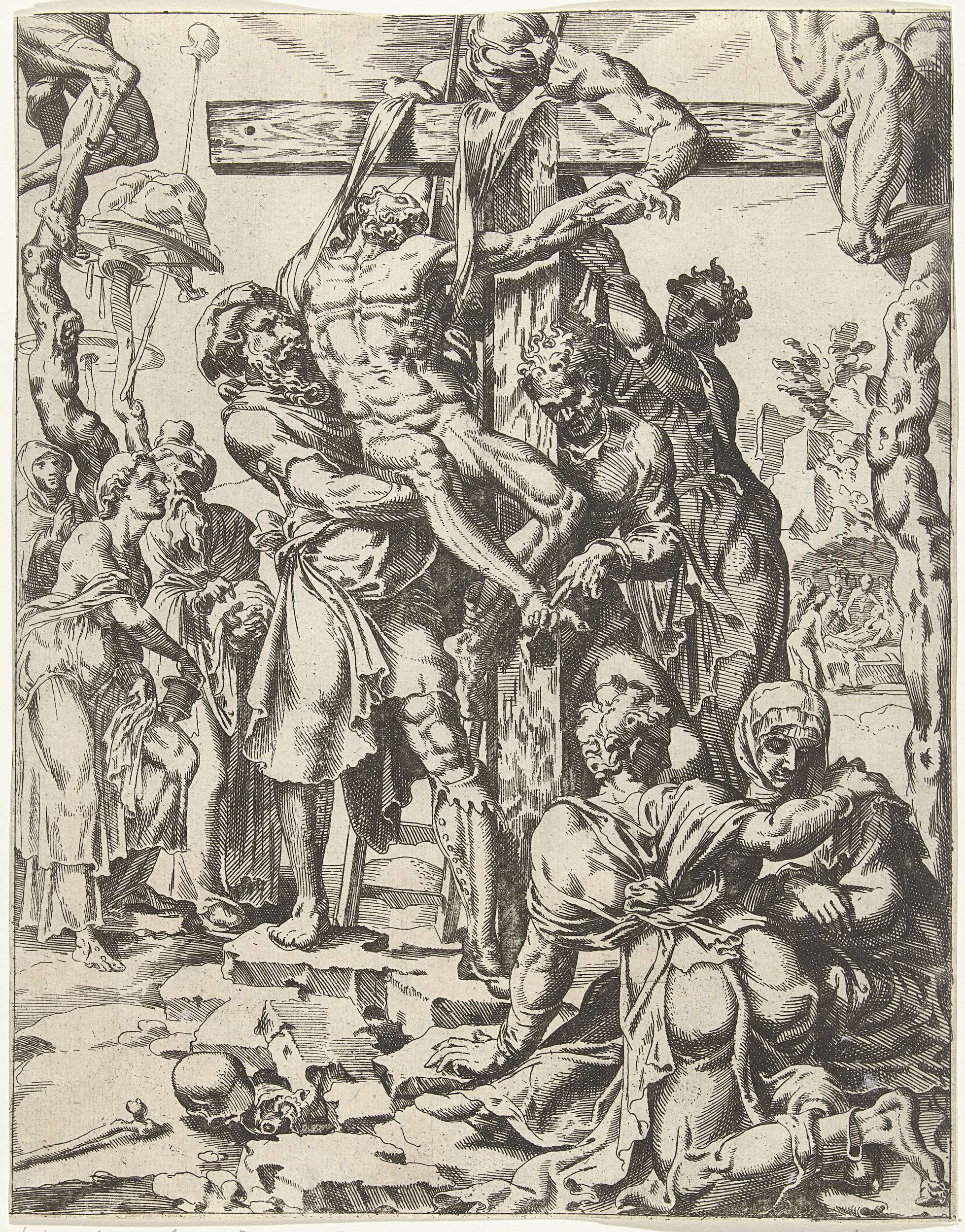 Christus wordt het kruis afgenomen door Jozef van Arimatea en Nikodemus. Anderen helpen. De prent is deel van een dertigdelige serie met prenten over de zondeval en Christus' passie.