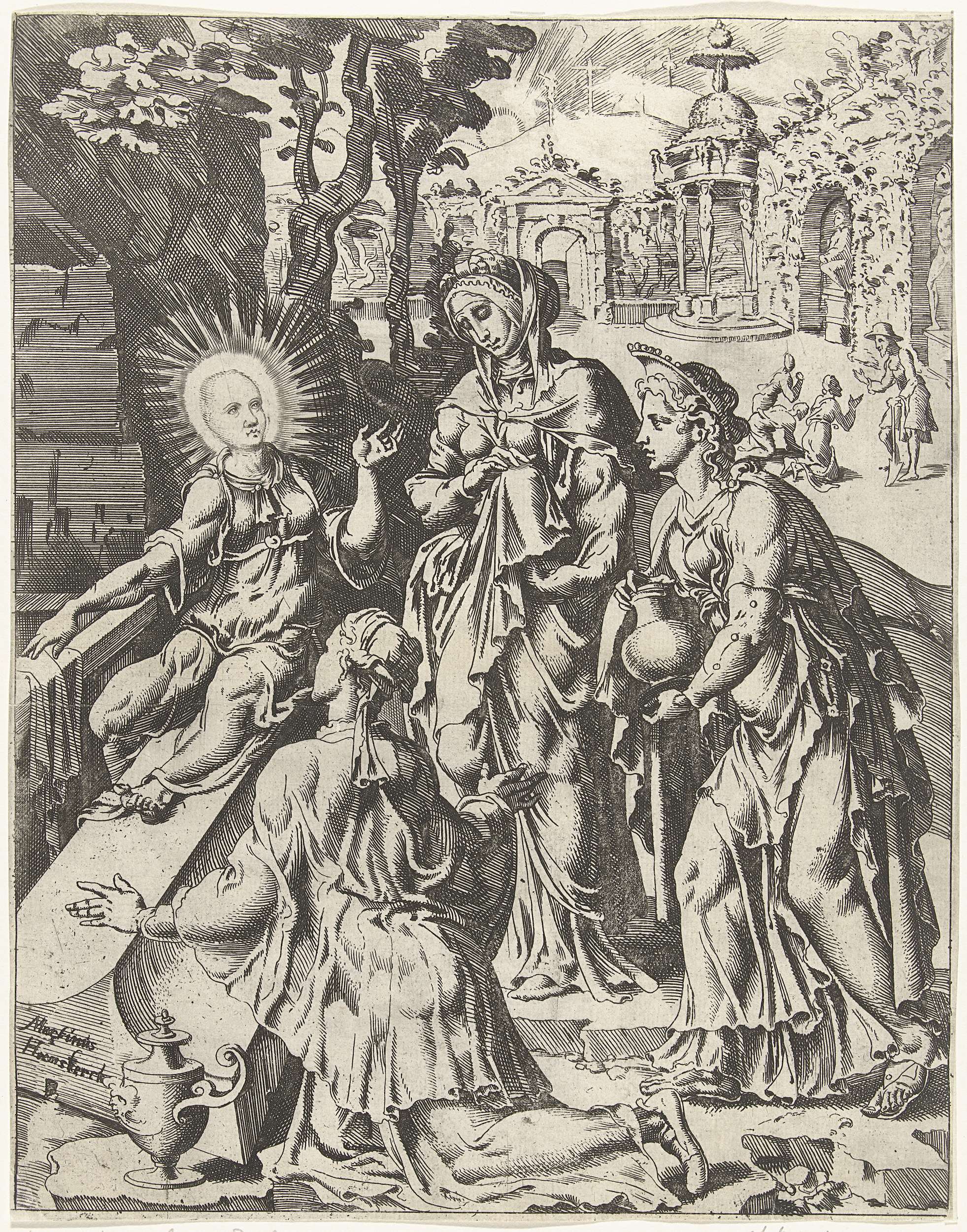 Bij het graf van Christus verschijnt een engel aan de drie heilige vrouwen die Christus kwamen zalven. Een van hen knielt. Op de achtergrond verschijnt Christus als tuinman aan de drie vrouwen. De prent is deel van een dertigdelige serie met prenten over de zondeval en Christus' passie.