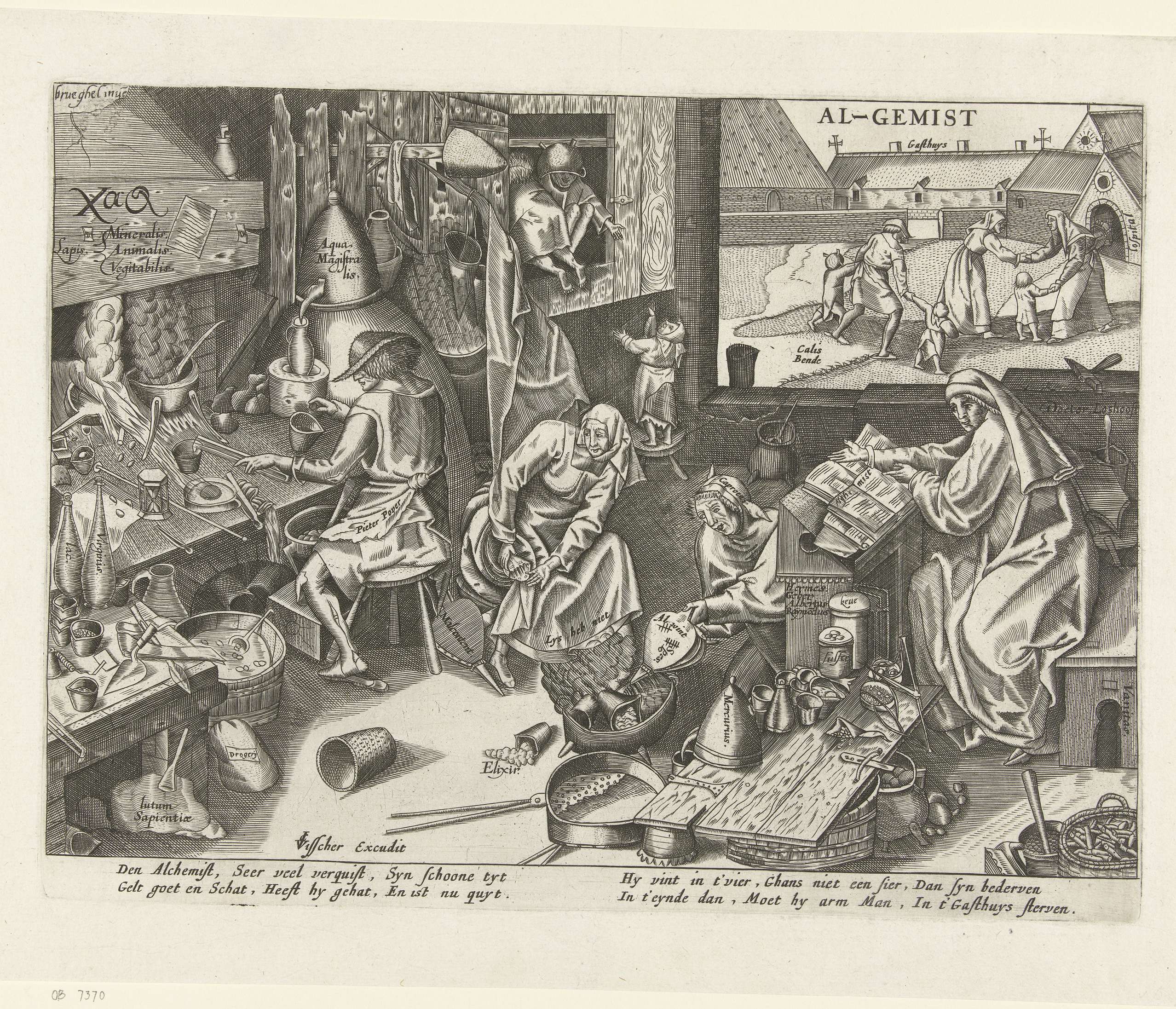 Gezin van alchemisten aan het werk in een werkplaats. Links is een man, genaamd Pieter Pover, bezig metalen te smelten op een fornuis en in het midden wordt met blaasbalgen een vuur opgestookt. Rechts een geleerde, genaamd Doctor Loshooft, achter boeken. Drie kinderen ontsnappen aan de chaos door door een luik te kruipen. Op de ...