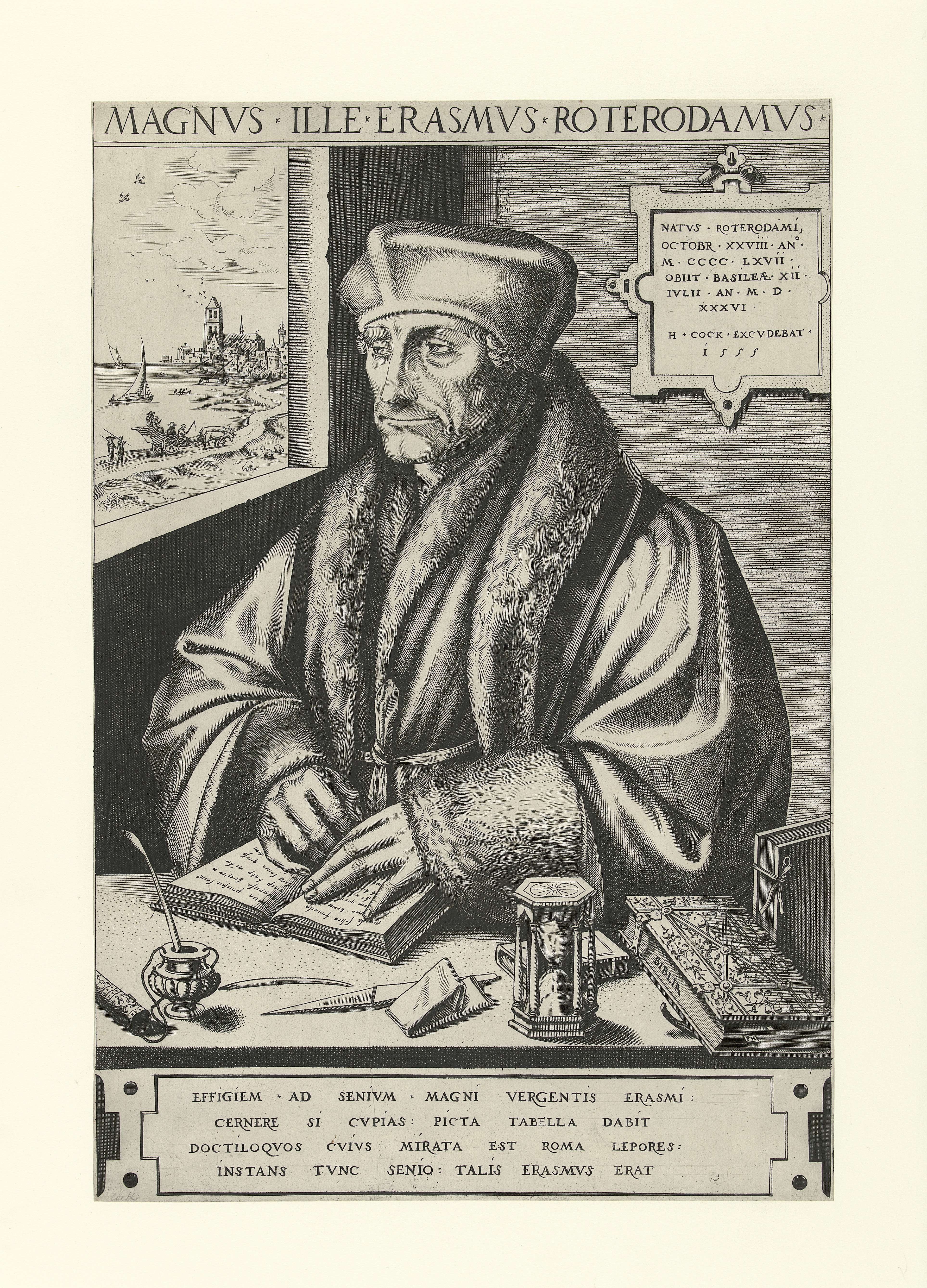 Portret van Desiderius Erasmus ten halven lijve naar links, gezeten aan een tafel, zijn handen rustend op een opengeslagen boek. Op de tafel een zandloper, inktpot met pen, pennenmes, bijbel en andere boeken. Aan de muur een plaquette, links een venster met zicht op een stad aan het water, waarschijnlijk Rotterdam. Onder de voorstelling een ...