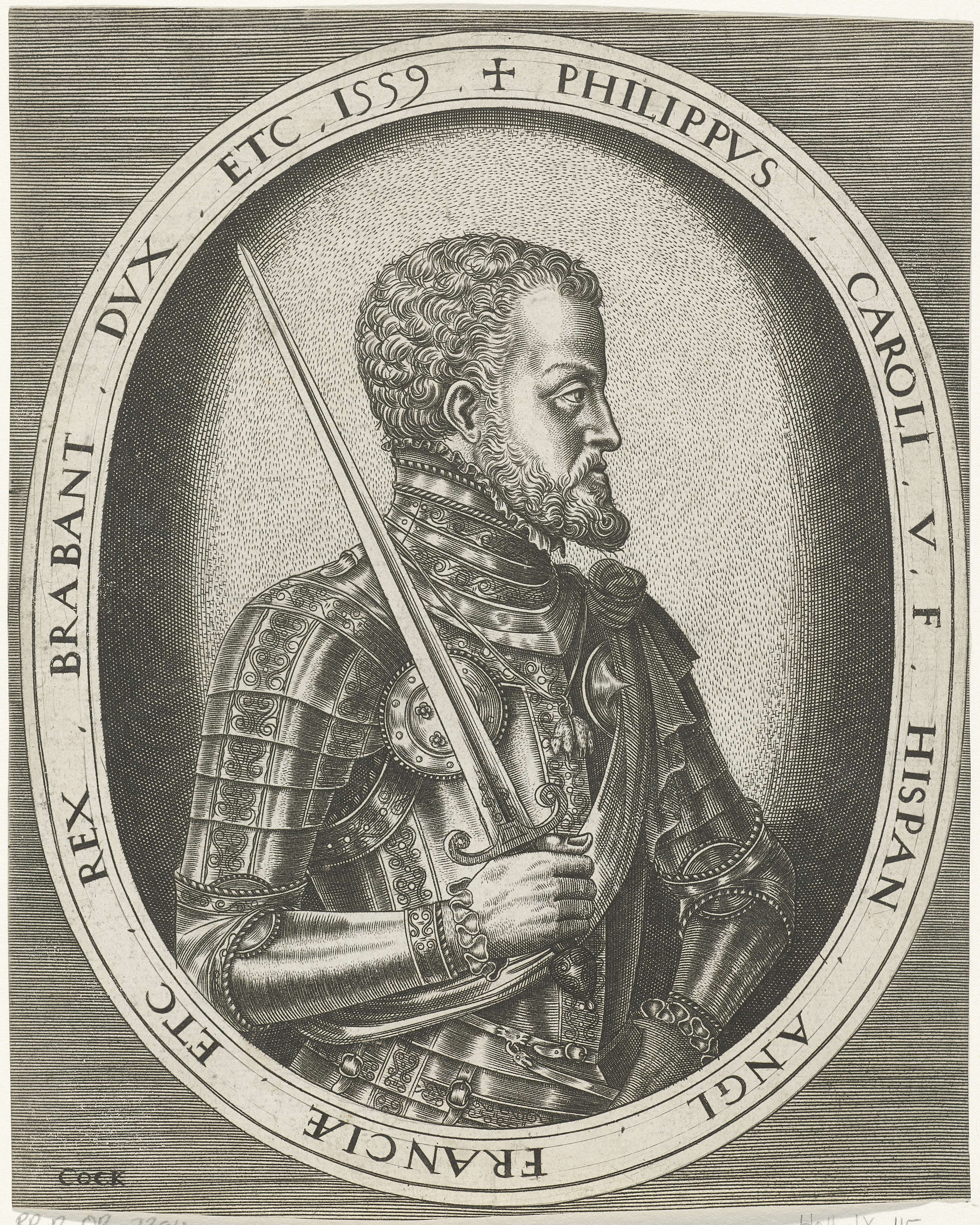 Portret van Filips II, koning van Spanje, ten halven lijve naar rechts met een zwaard in zijn rechterhand in een ovale lijst met randschrift in het Latijn.