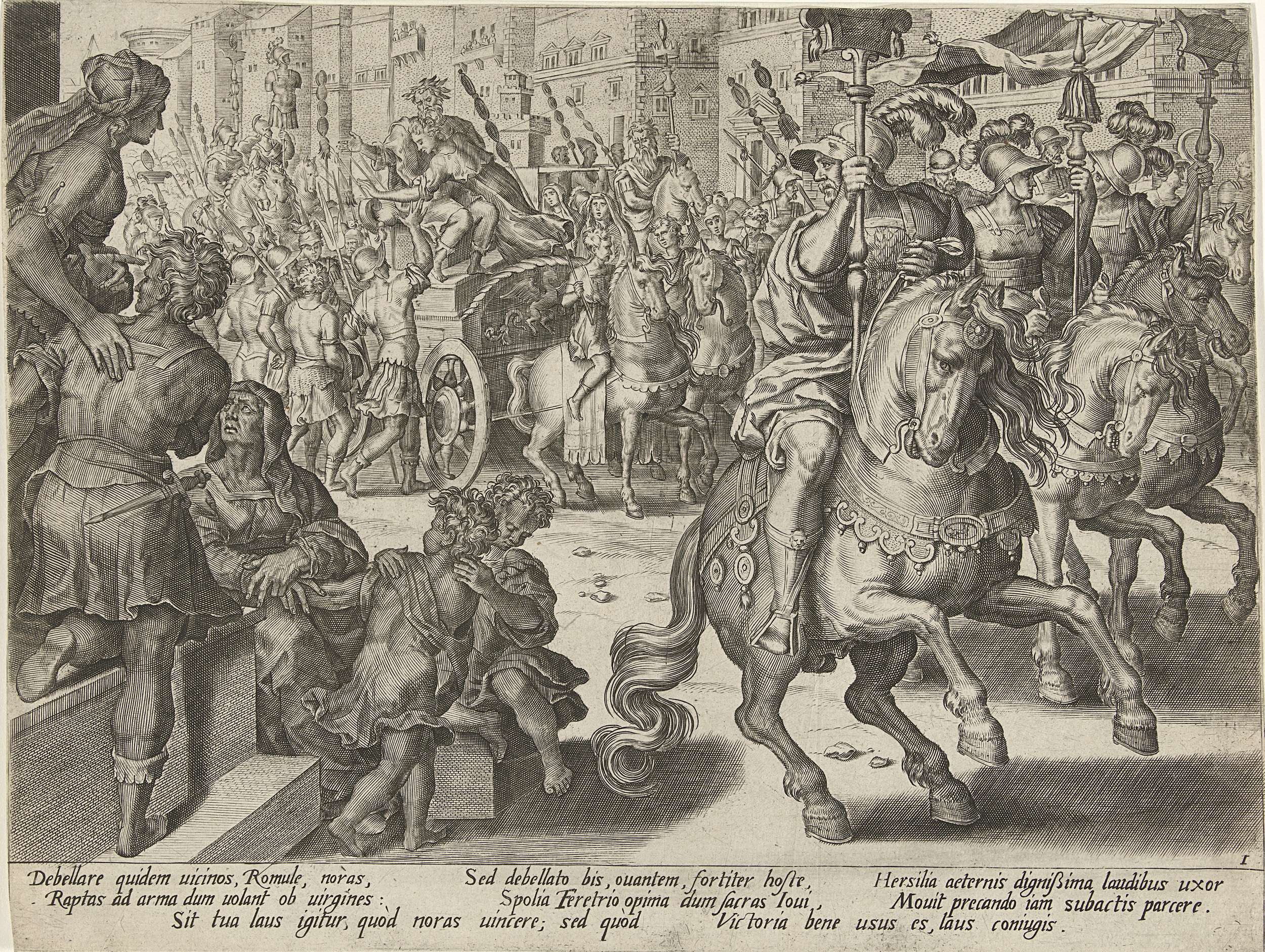 Optocht met Romulus en zijn echtgenote Hersilia op een zegekar. Een menigte mensen loopt mee, op de voorgrond soldaten te paard. In de marge onder de voorstelling staat een tekst in het Latijn, rechtsonder genummerd: 1. De prent maakt deel uit van een serie prenten die gebeurtenissen uit de Romeinse geschiedenis verbeelden.