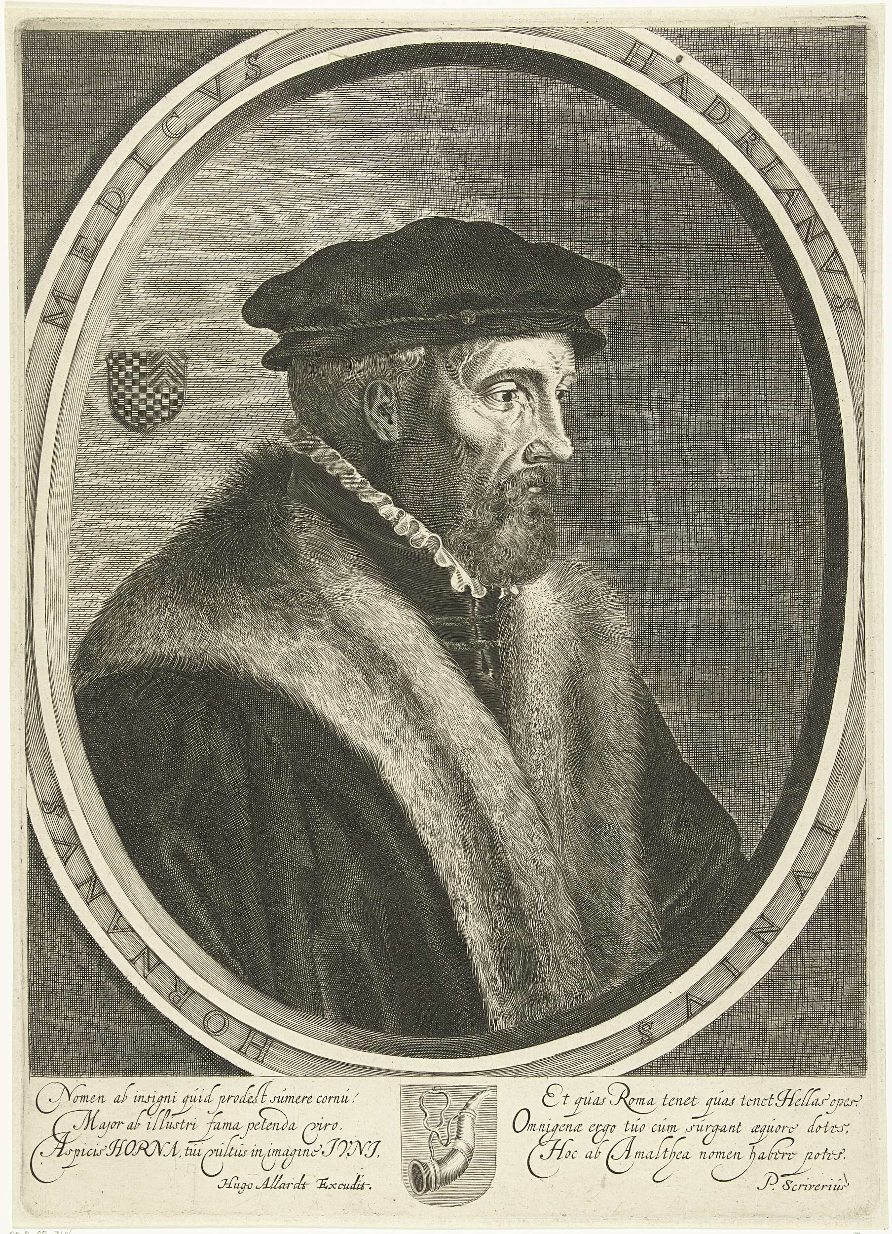Borstbeeld van Hadrianus Junius, arts in Hoorn. In ovale omlijsting met randschrift. Onder het portret een Latijns vers en het stadswapen van Hoorn.