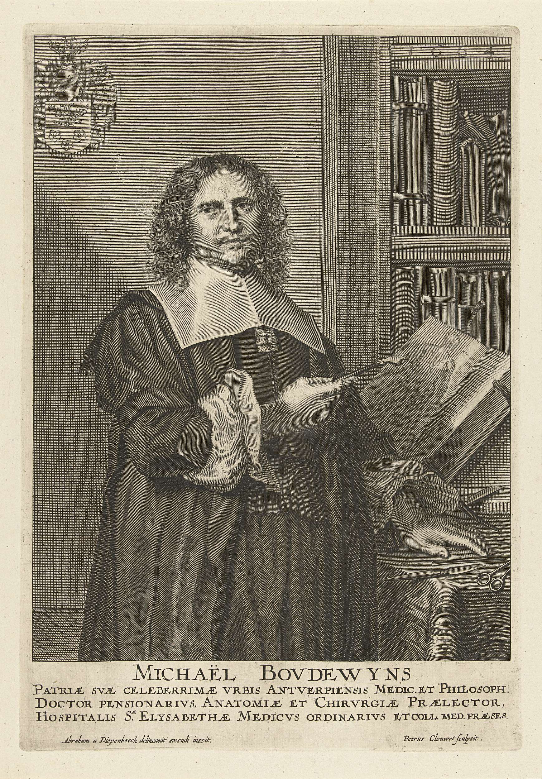 Portret van de Antwerpse chirurgijn en geneesheer Michiel Boudewijns in zijn studeerkamer. Hij staat voor zijn bureau en bestudeert een boek over anatomie. De prent heeft een Latijns onderschrift.