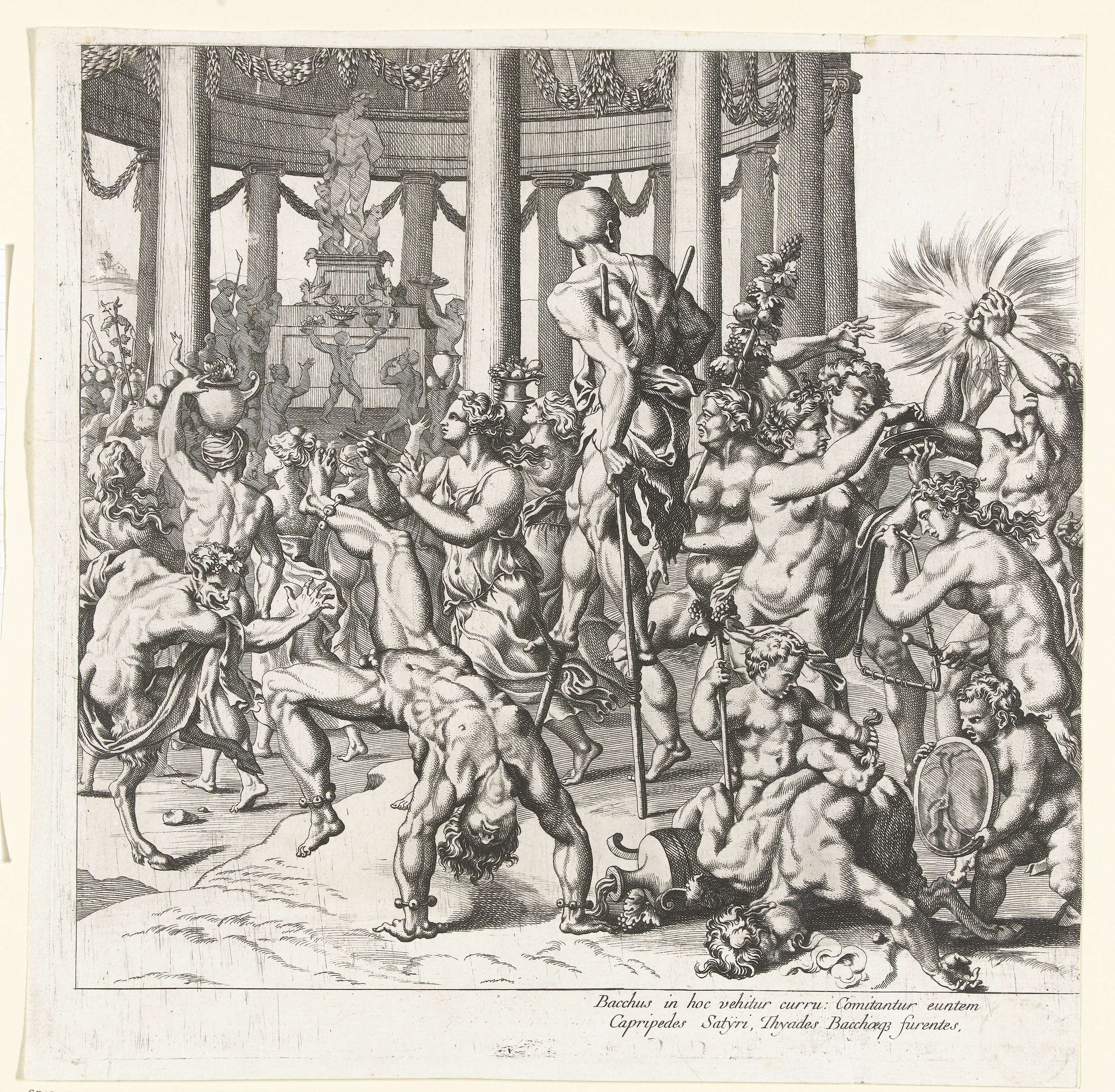 Optocht ter ere van de God Bacchus. De stoet arriveert bij een tempel ter ere van Bacchus. Saters dansen uitgelaten en anderen maken muziek of halen allerlei ongein uit. In het midden loopt een man op stelten. Linker deel van een prent bestaande uit twee platen.