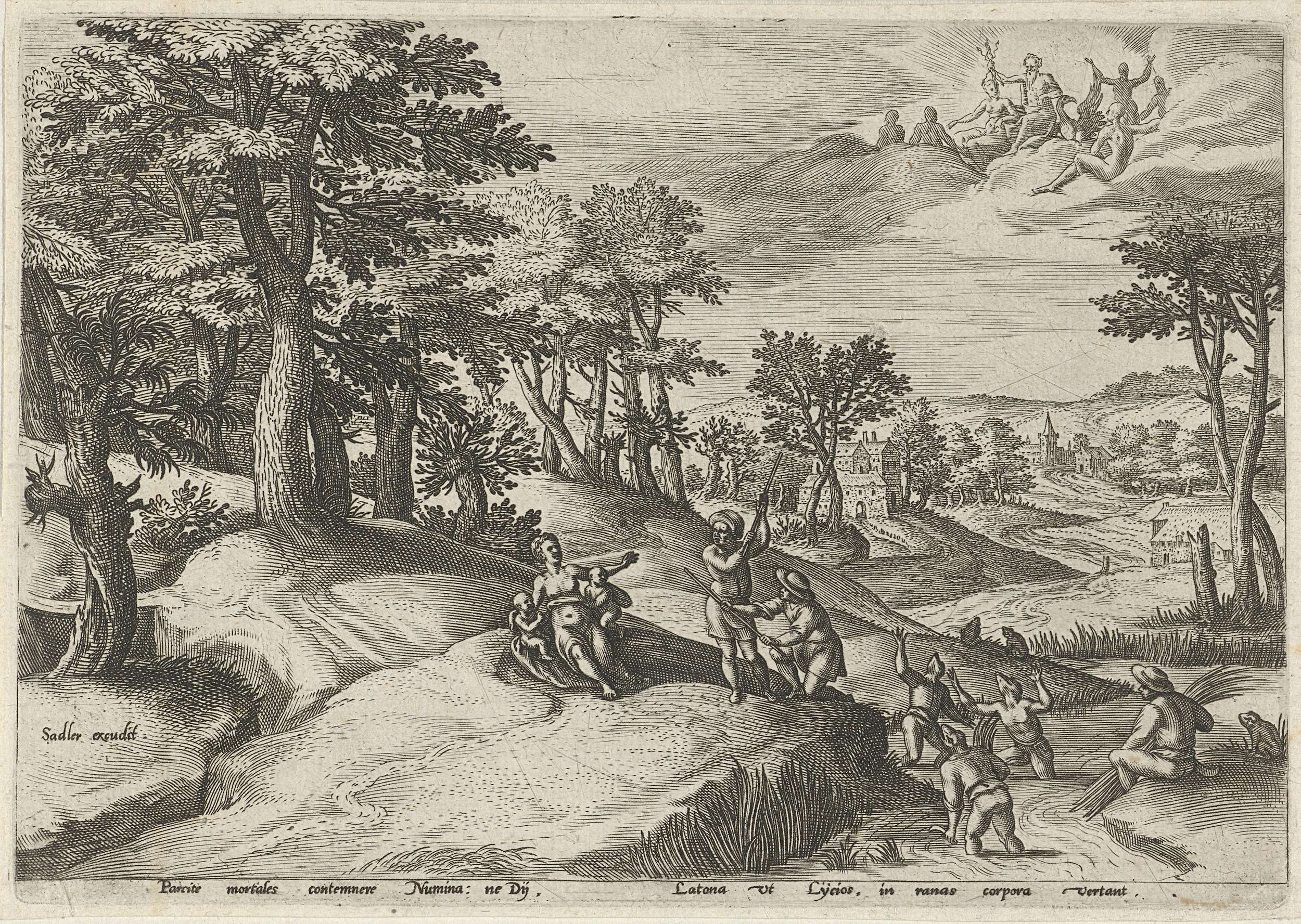 Landschap met een rivier. Leto zit met haar twee kinderen aan de oever van de rivier. Naast haar veranderen de Lyciërs in kikkers omdat ze haar verboden hadden water van de rivier te drinken. Rechtsboven Jupiter, Juno en de andere goden in de wolken. De derde prent van een zesdelige serie van landschappen met mythologische ...