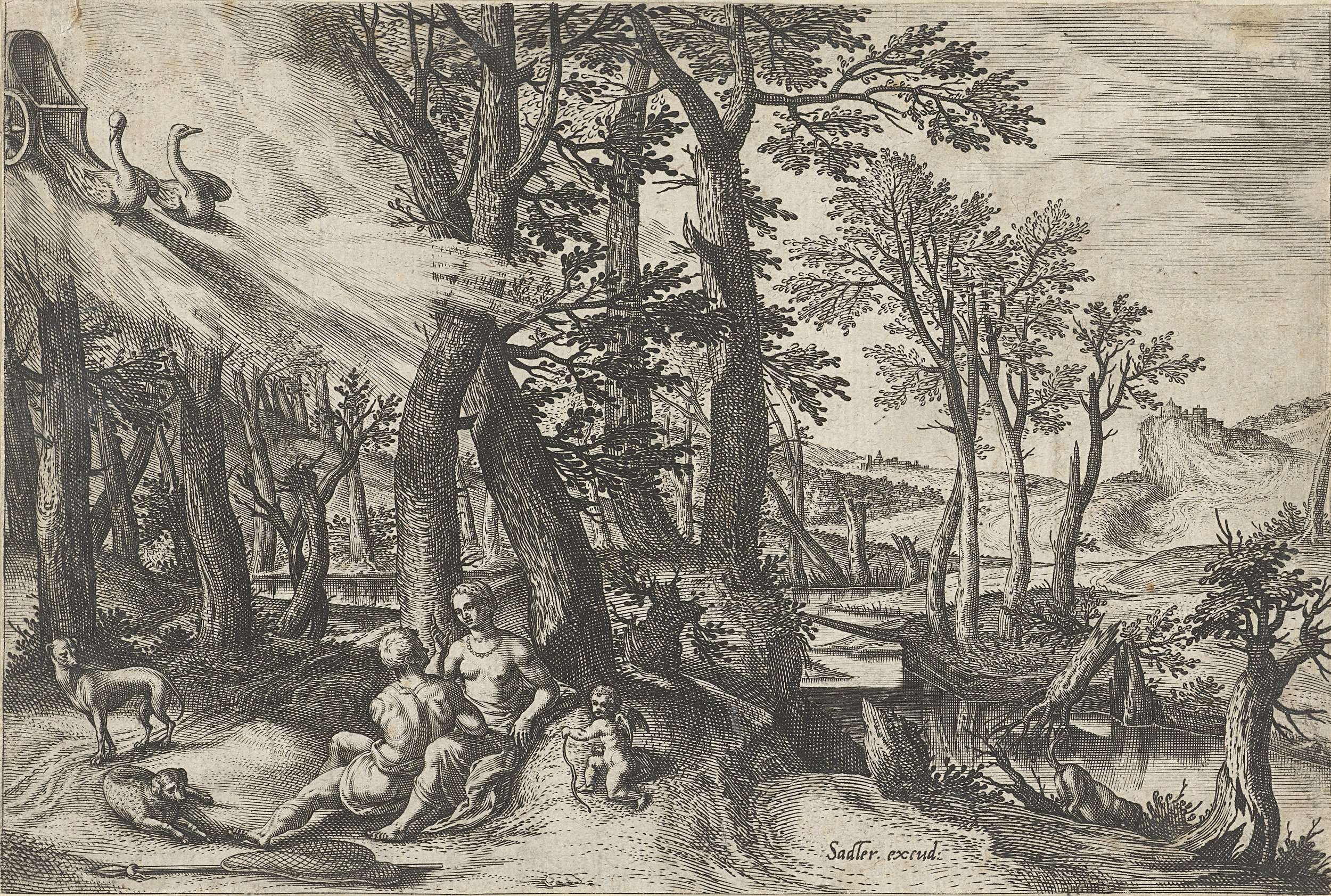 Bebost landschap met een rivier. Venus en Adonis zitten op de grond, samen met Amor en twee honden. In de linkerbovenhoek een zegewagen getrokken door twee zwanen. De vierde prent van een zesdelige serie van landschappen met mythologische scènes.