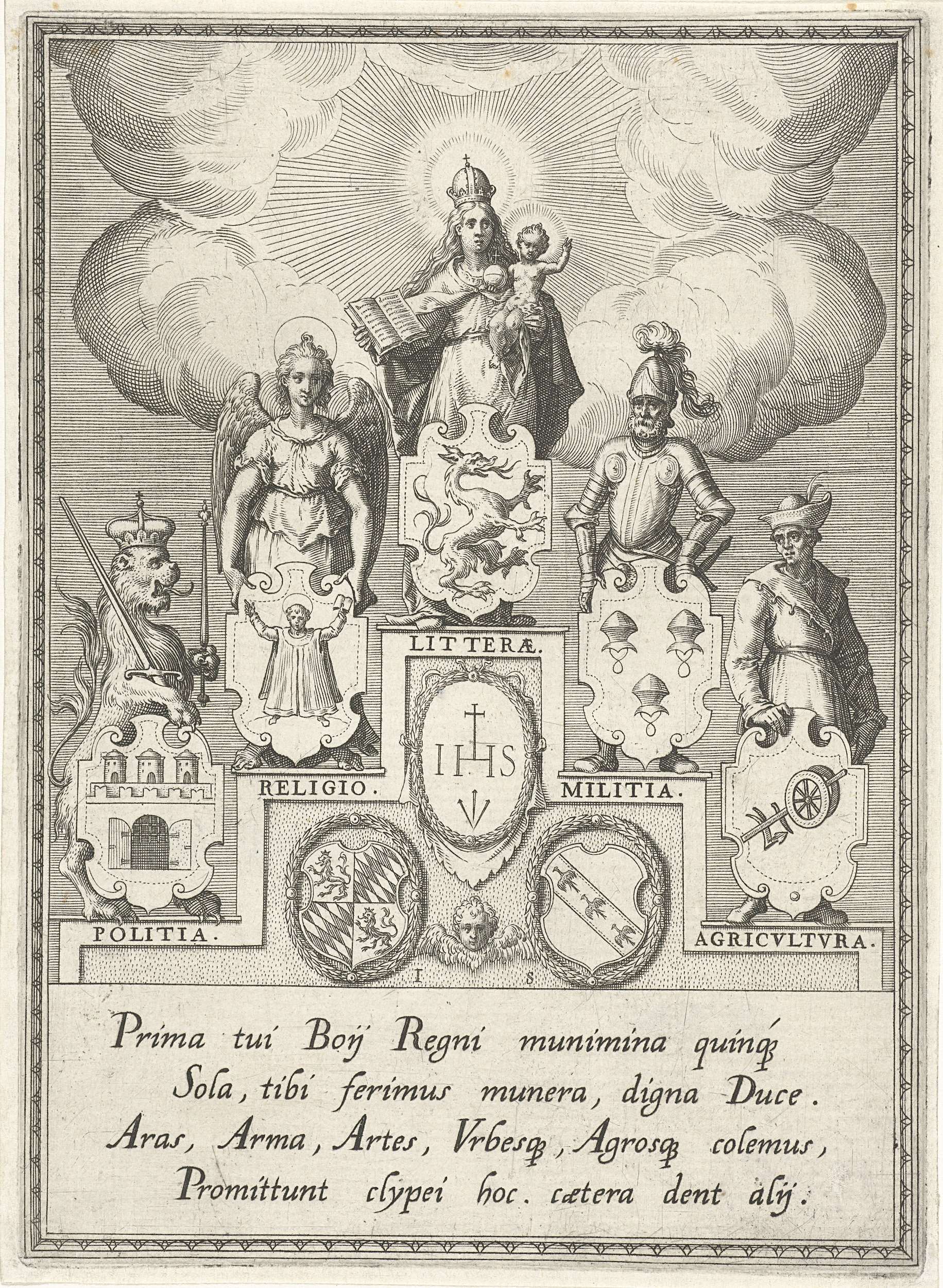 Op een trap de personificaties van de politiek, de religie, de literatuur, de krijgskunst en de landbouw. Links Politiek (Politia) in de gedaante van een gekroonde leeuw met een wapen, daarnaast Religie (Religio), een engel met een wapen waarop een priester is afgebeeld. Rechts Landbouw (Agricultura), een landman met wapen waarop een ploeg; daarnaast Krijgskunst ...