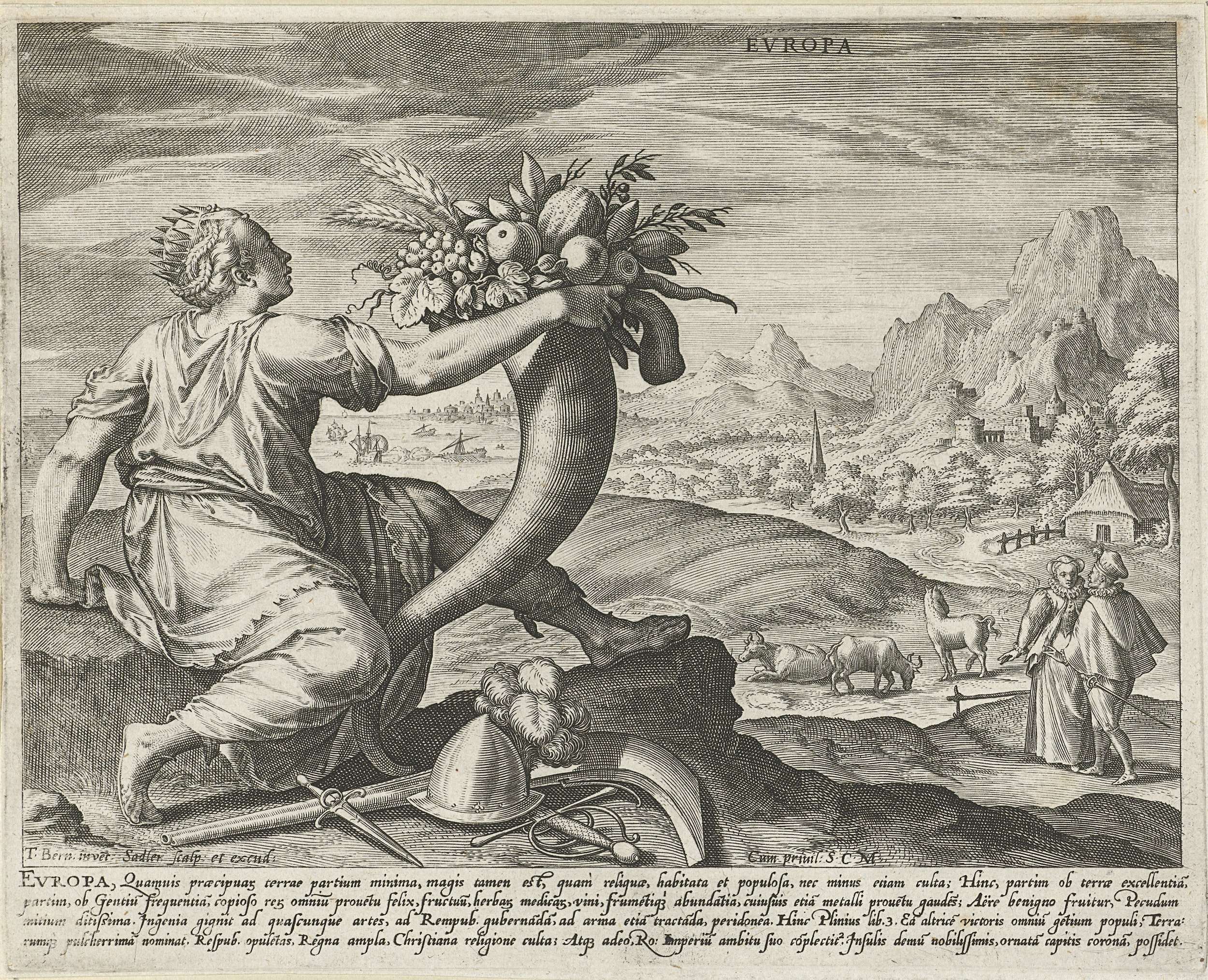 De vrouwelijke personificatie van het continent Europa op de voorgrond. In haar handen de hoorn des overvloeds. Op haar hoofd draagt zij als koningin van de wereld een kroon. Op de achtergrond een Europees landschap met een Europees gekleed paar en enkele inheemse dieren zoals koeien en paarden. De prent heeft een Latijns onderschrift en ...