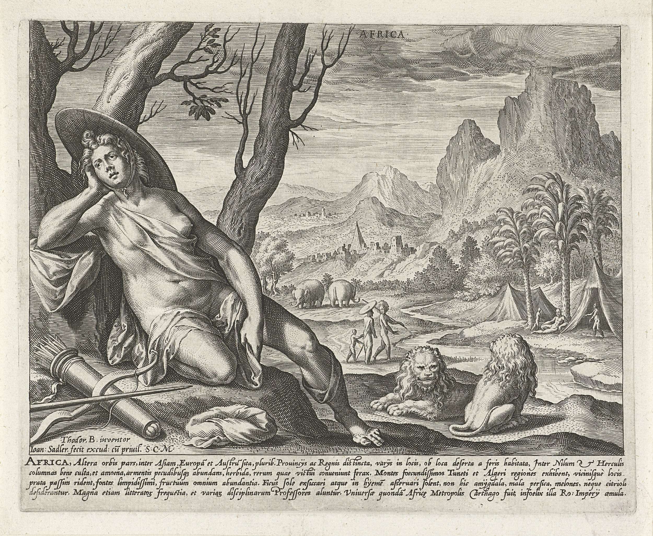 De vrouwelijke personificatie van het continent Afrika op de voorgrond. Naast haar liggen pijl en boog. Op haar hoofd draagt zij een grote ronde hoed. Op de achtergrond een Afrikaans landschap met een Afrikaans gekleed paar en enkele inheemse dieren zoals leeuwen en olifanten. De prent heeft een Latijns onderschrift en is deel van een ...