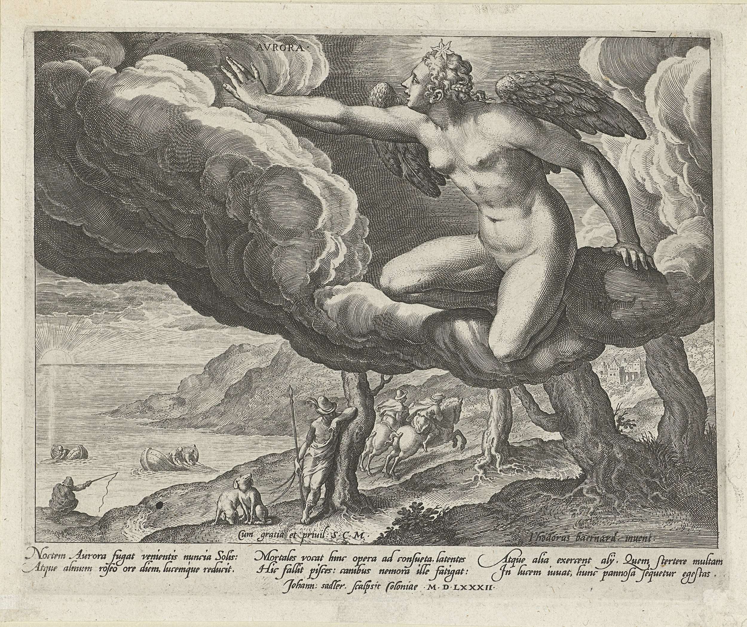 De gevleugelde Aurora, de personificatie van de dageraad in de wolken. Ze verjaagt de nacht. Op haar hoofd een ster. Onder haar een ochtendlandschap met jagers op pad. Links op de achtergrond vissers op zee. In de marge een Latijns onderschrift met uitleg over de dageraad. De prent maakt deel uit van een vierdelige serie ...