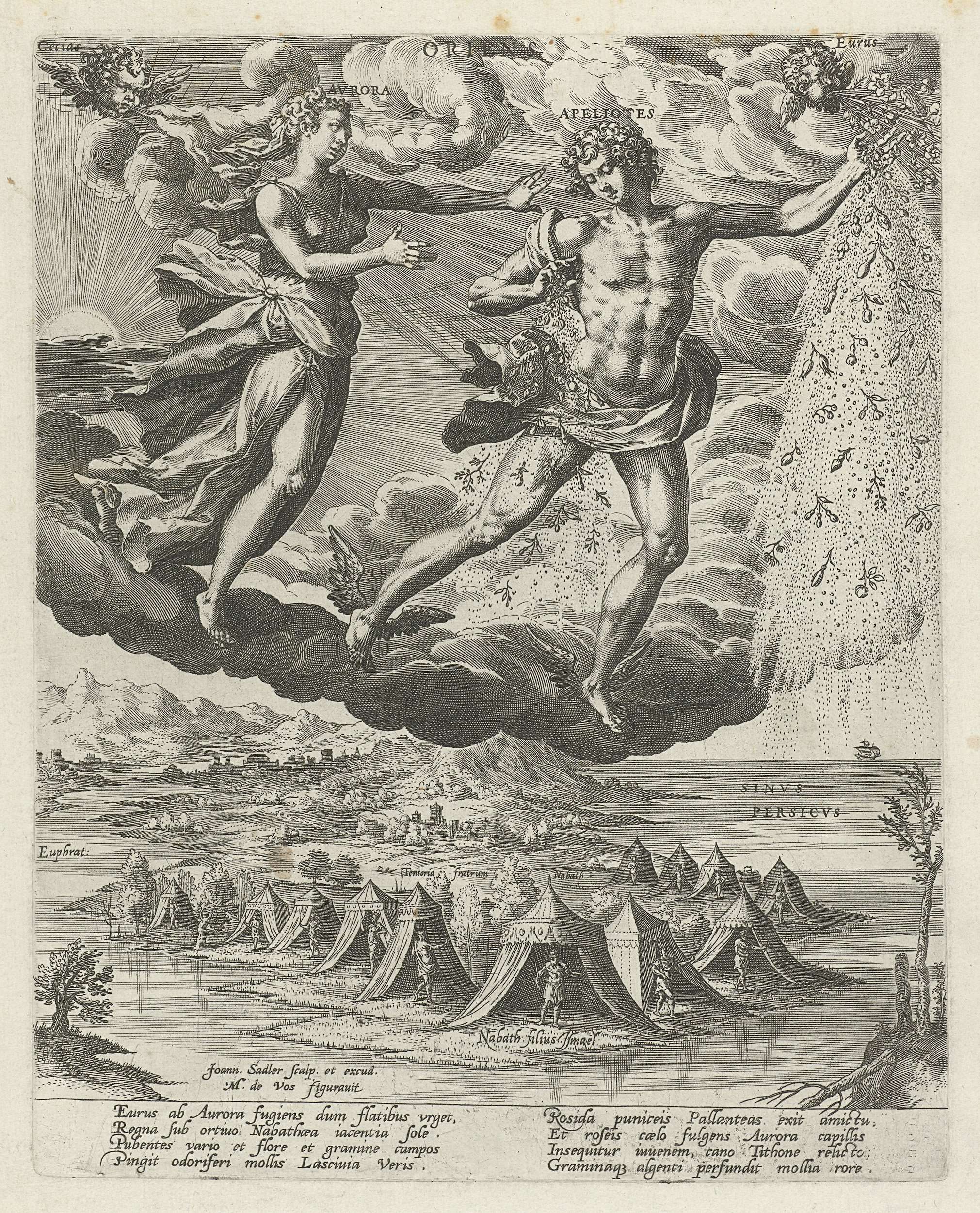 In de lucht Aurora, godin van de dageraad. Ze rent haar geliefde Apeliotes (de oostenwind) achterna. In de linkerhoek blaast Caecias, de noordoostenwind. In de rechterhoek blaast de zuidoostenwind Eurus. Eureus zijn wind wordt met bloemen vergezeld, die door Apeliotes worden verspreid over de aarde. Onderaan een Arabisch landschap met op een eiland tussen Eufraat ...