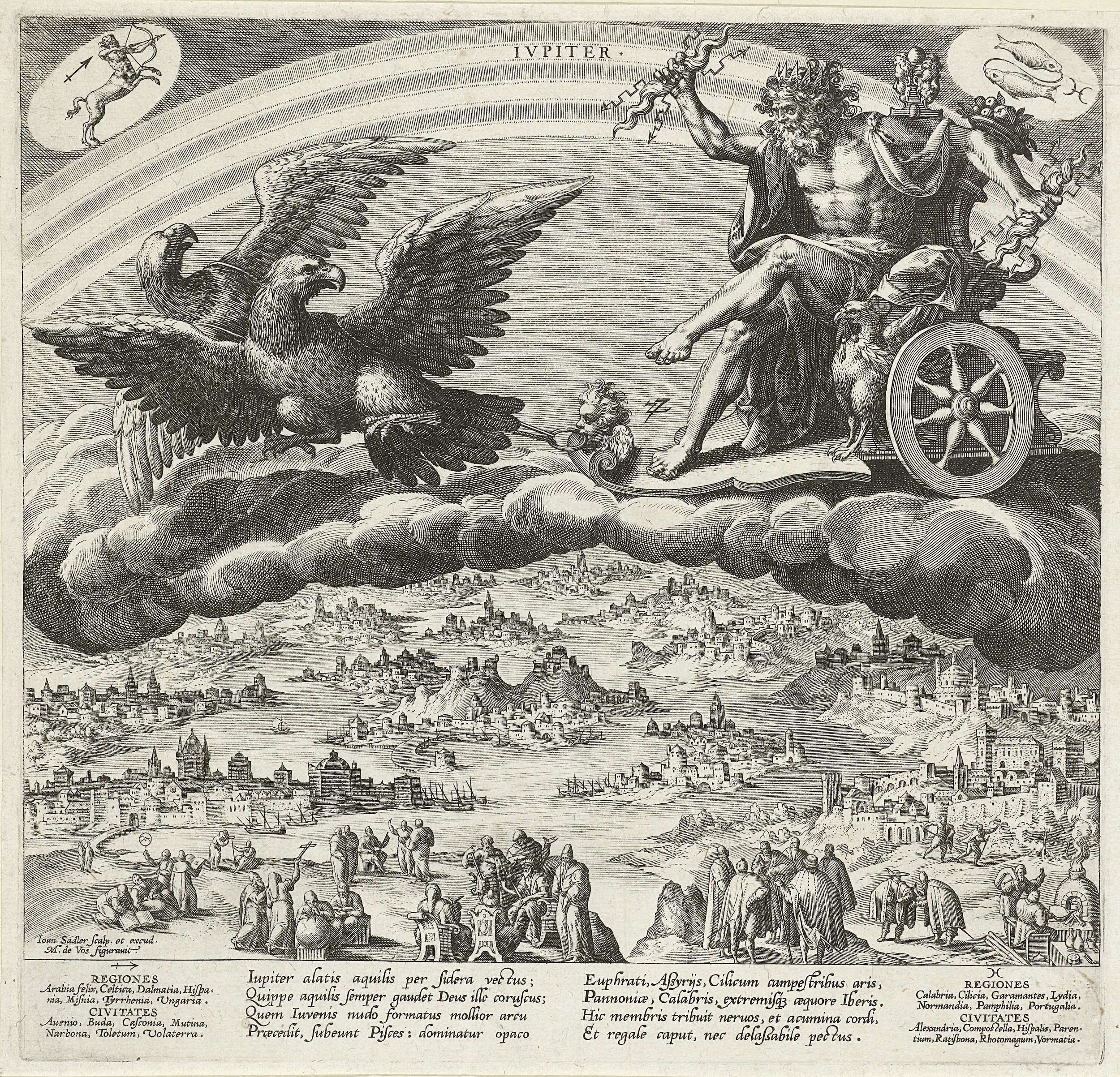 De god Jupiter met bliksemschichten in de hand. Hij rijdt in zijn zegewagen die wordt getrokken door twee adelaars. In de linkerbovenhoek het sterrenbeeld Boogschutter, rechts Vissen. Onderaan een rivierlandschap met de havens van Mesopotamië, het Ottomaanse Rijk, Italië, Spanje en Hongarije. Op de voorgrond geleerden die wetenschap bedrijven. Middenvoor een koning die naar zijn ...