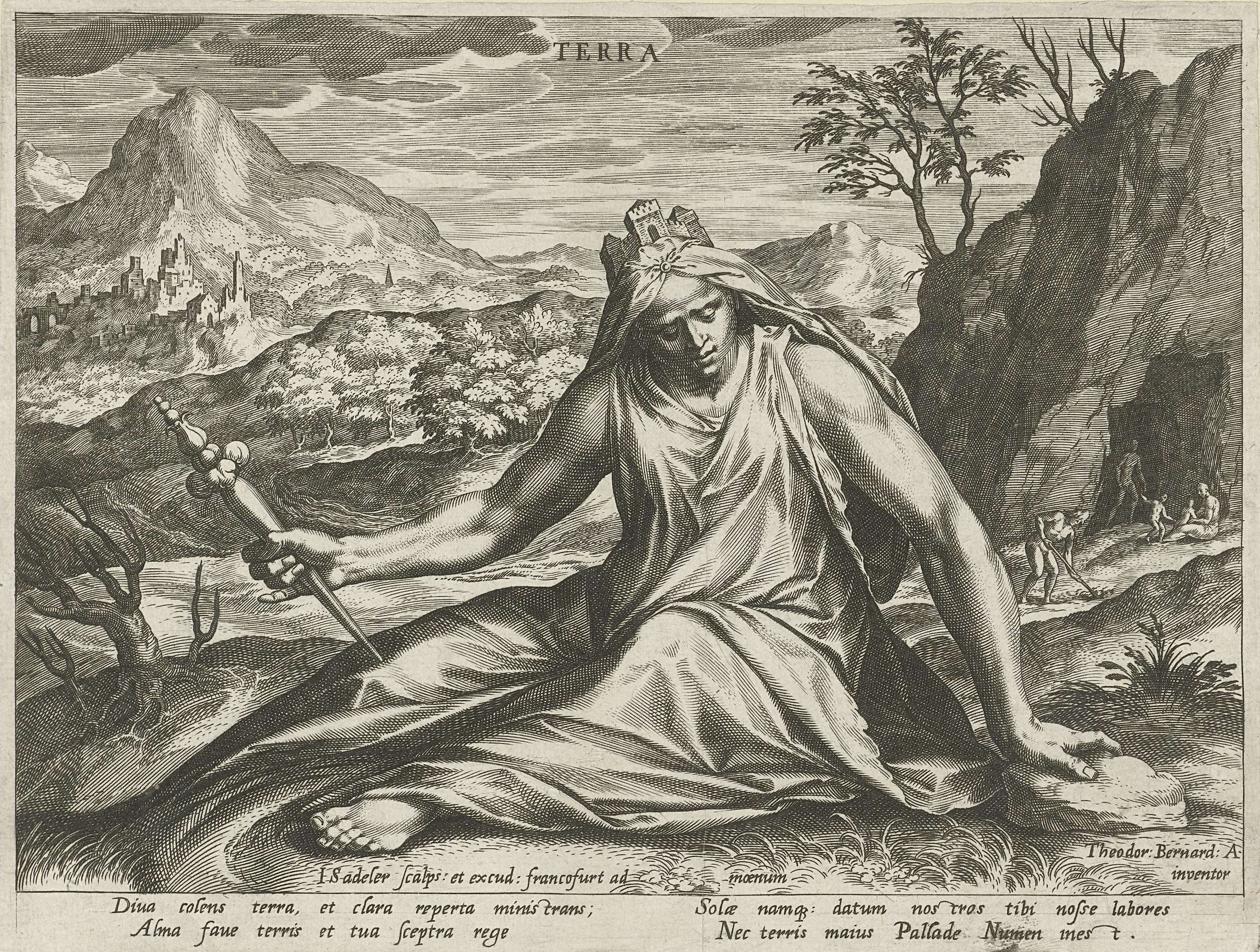 Het element aarde, gepersonifieerd door de godin Cybele. Ze draagt een muurkroon en houdt een scepter in de hand. Op de achtergrond links enkele mensen bij een grot. De prent heeft een Latijns onderschrift en is deel van een vierdelige serie over de vier elementen.