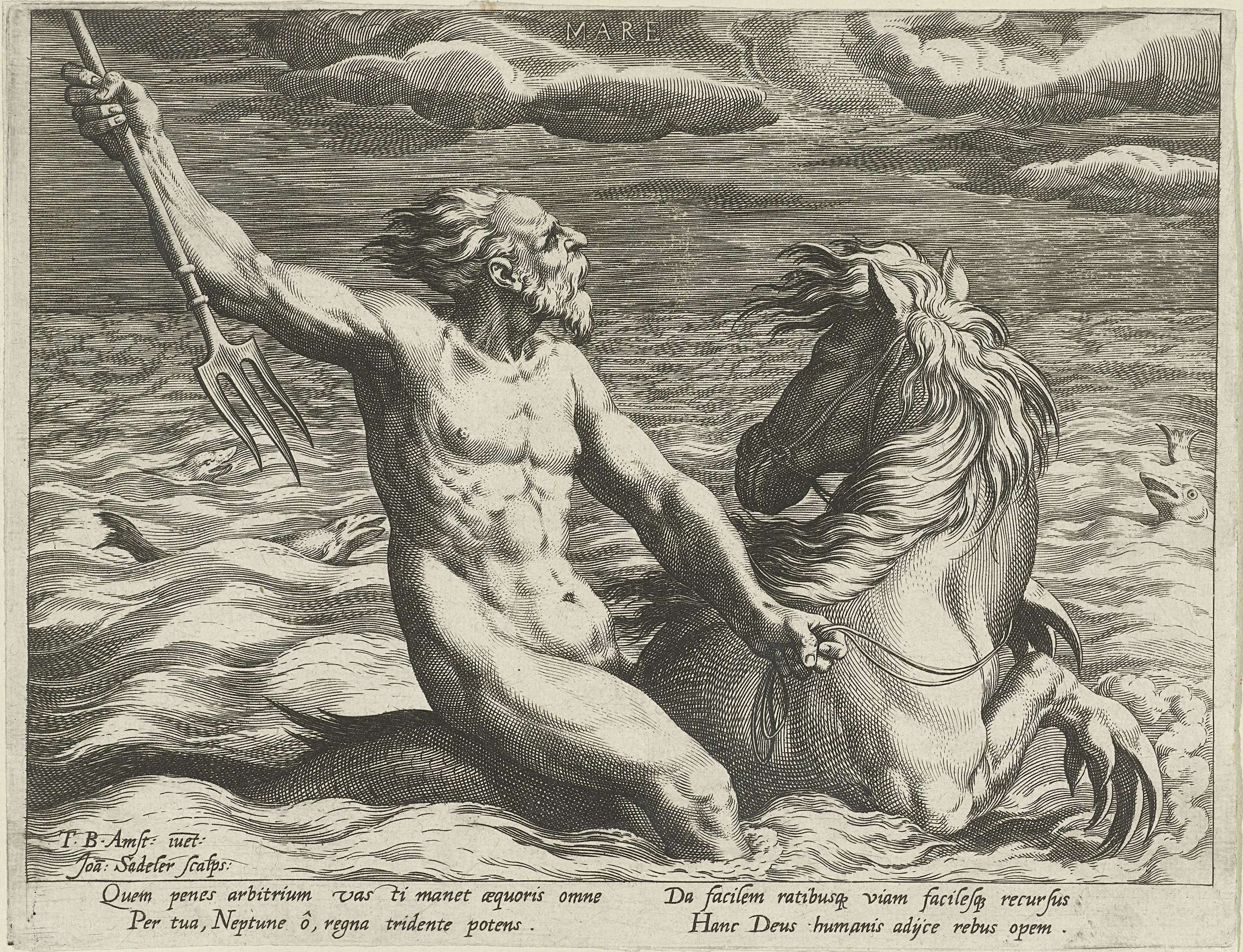 Het element water, gepersonifieerd door Neptunus, rijdend op een zeepaard. In zijn ene hand een drietand. De prent heeft een Latijns onderschrift. en is deel van een vierdelige serie over de vier elementen.