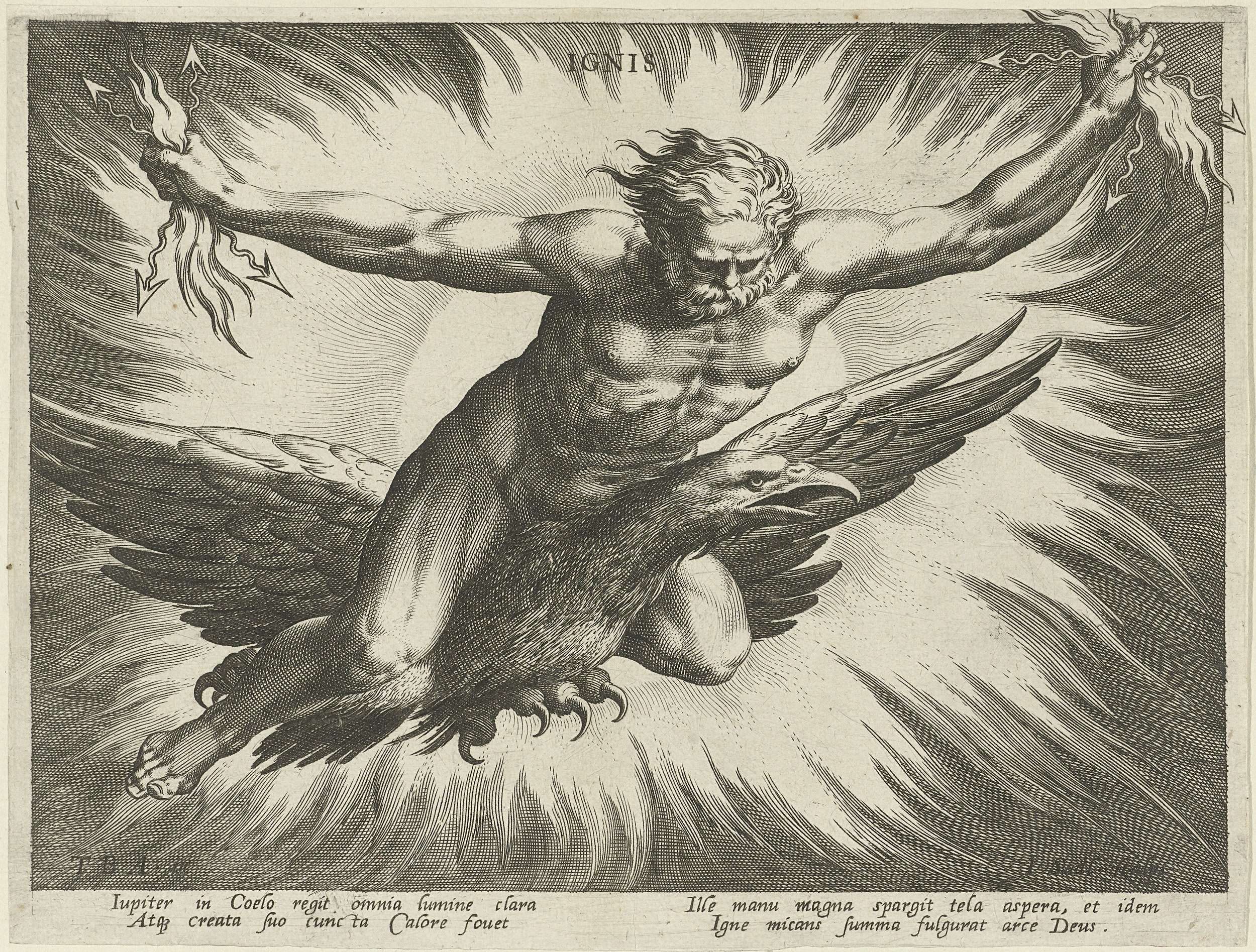 Het element vuur, gepersonifieerd door de naakte Jupiter. Hij is omringd door vlammen en houdt een bliksemstraal in beider handen. Jupiter vliegt op een adelaar. De prent heeft een Latijns onderschrift en is deel van een vierdelige serie over de vier elementen.