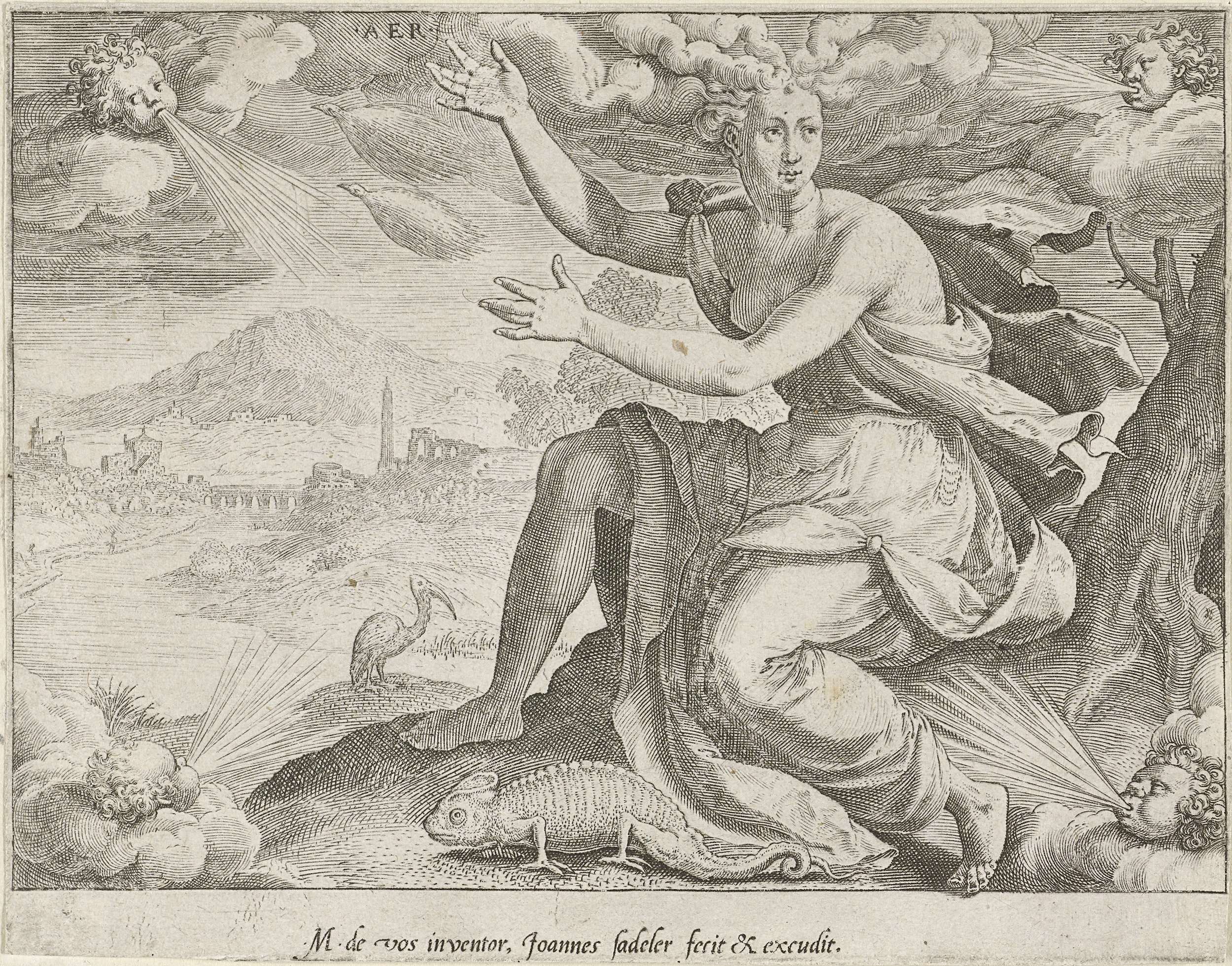De vrouwelijke personificatie van het element lucht. Rondom haar hoofd wolken. Aan haar voeten een kameleon. In de vier hoeken een blazende wind. De prent maakt deel uit van een serie met als onderwerp de vier elementen.