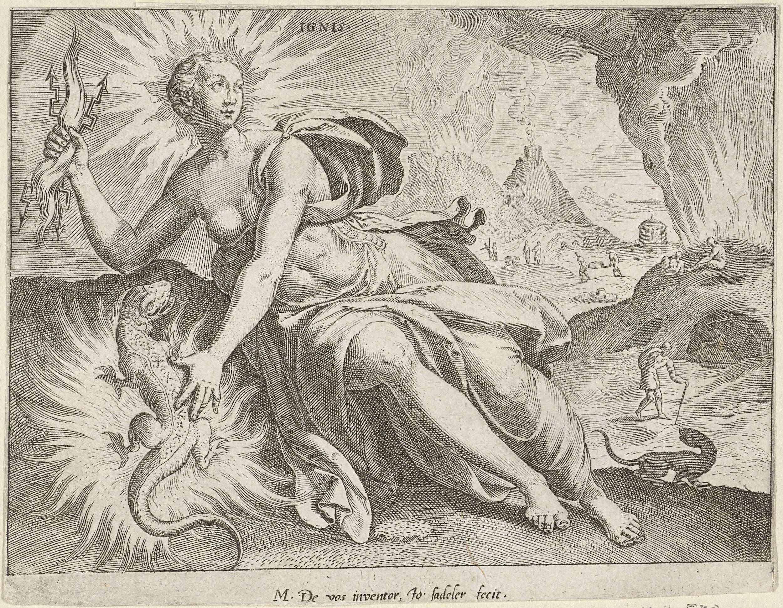 Personificatie van het vuur: zittende vrouw in landschap, in de rechterhand een bliksemschicht, in de linkerhand een salamander. Op de achtergrond een vuurzee.