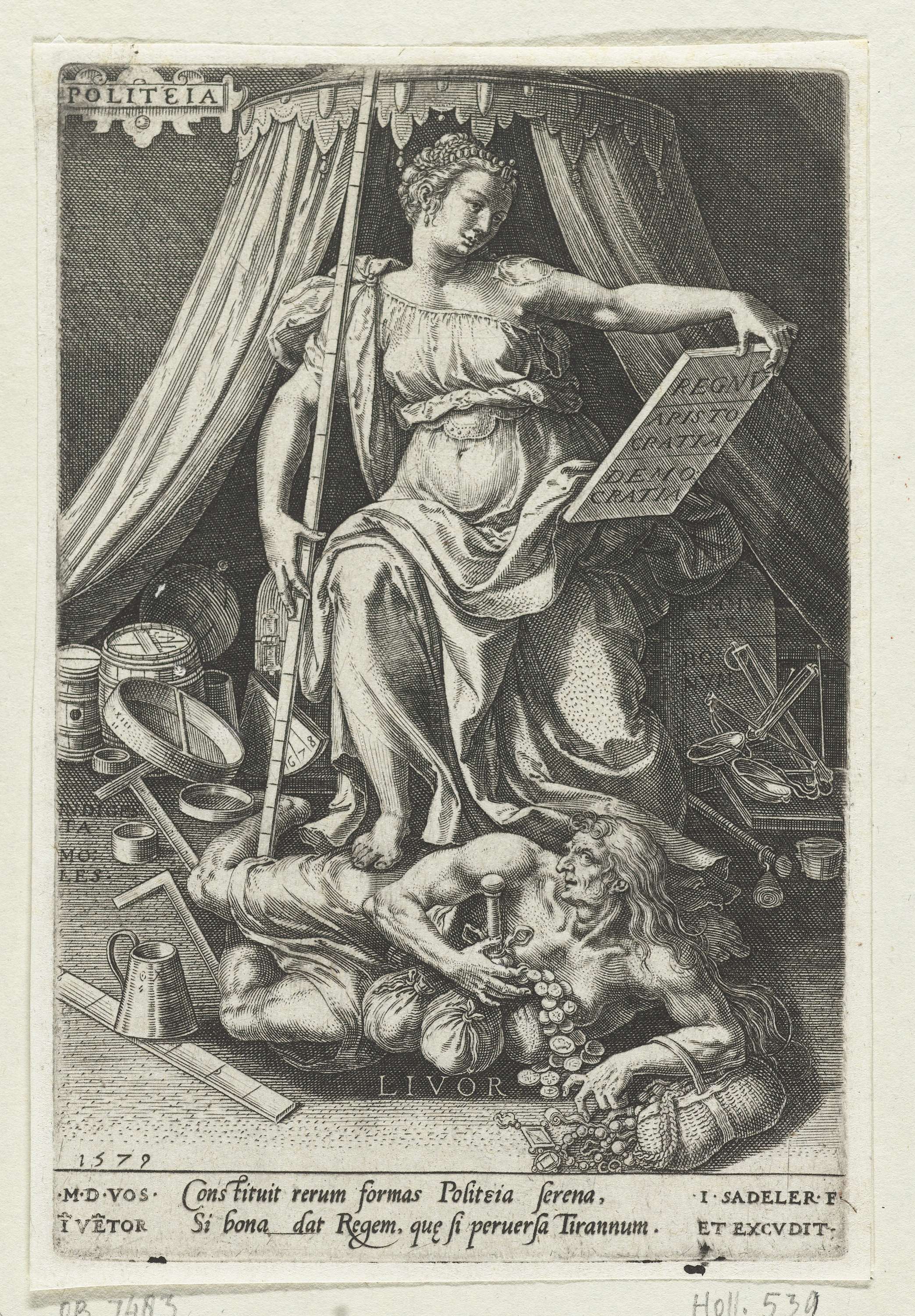De personificatie Staatskunst (Politeia), met meetlat en schrijftablet, zit op een troon. Ze vertrapt de personificatie van Afgunst (Livor), een naakte vrouw die haar rijkdommen in haar armen houdt. Op de achtergrond allerlei meetinstrumenten met de naam Wanorde (Indigesta Moles).