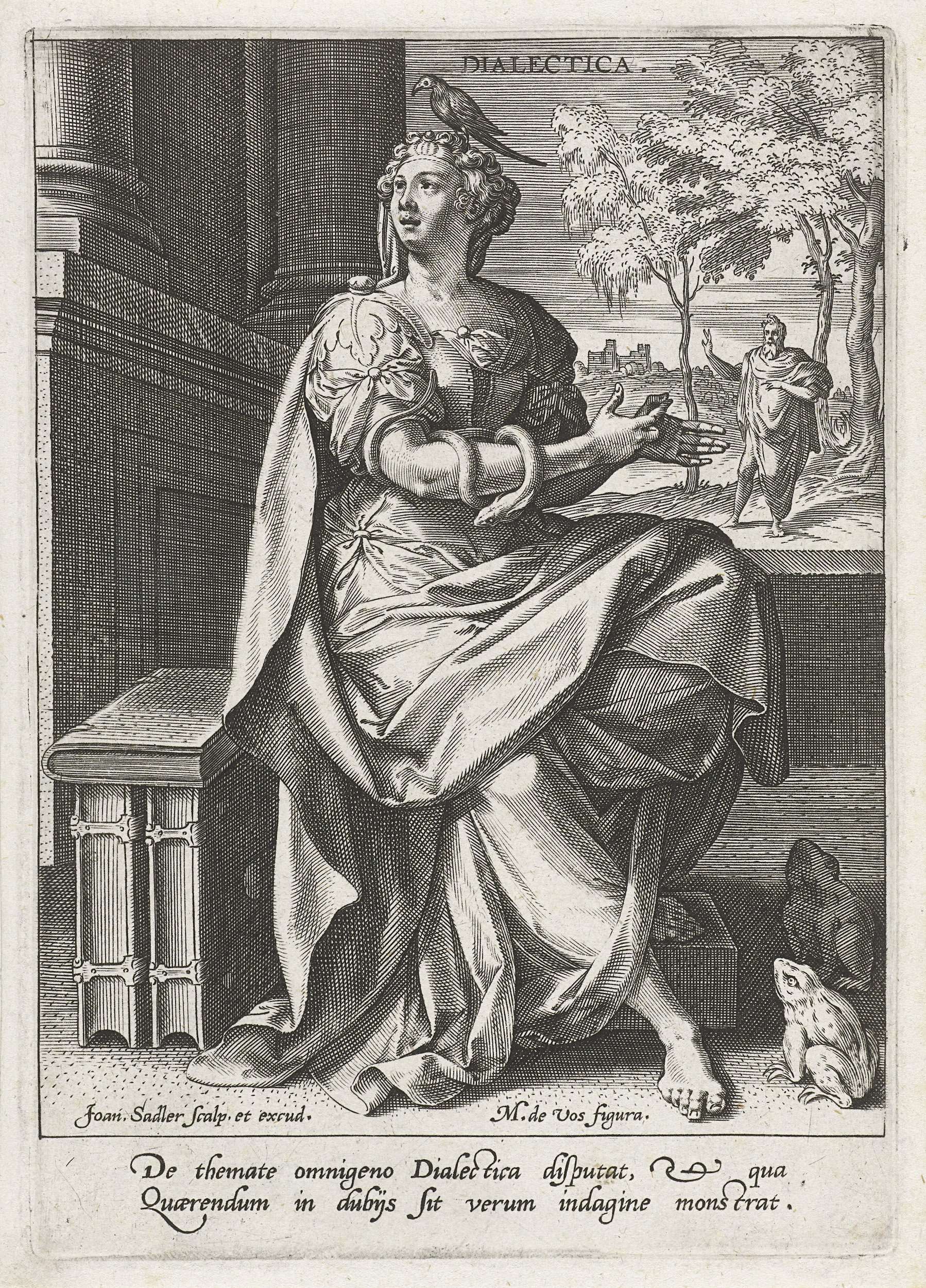 De personificatie van de dialectica zit op een stoel. Ze telt haar argumenten op met haar vingers. Een aal is rond haar arm gedraaid. Op haar hoofd een ekster, op de grond twee kikkers. Naast dialectica een stapel boeken van belangrijke denkers. Op de achtergrond een filosoof onder een boom. De prent heeft een Latijns ...