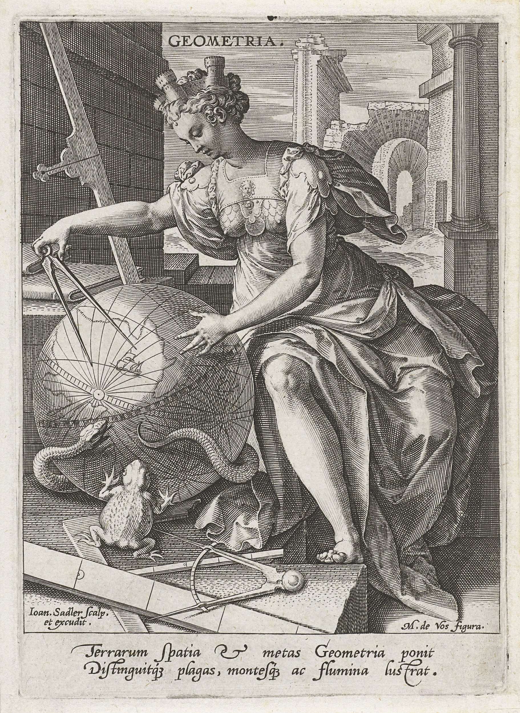 Geometrie staat afgebeeld op een bouwterrein, gebogen over een wereldbol. Zij probeert met een passer de wereld op te meten. De personificatie van de meetkunde draagt een stedenkroon. Aan de basis van de wereldbol zijn een slang en een kikker waar te nemen: symbolen voor de creativiteit die van de structurele meetkunde werd geëist. Geometrische ...