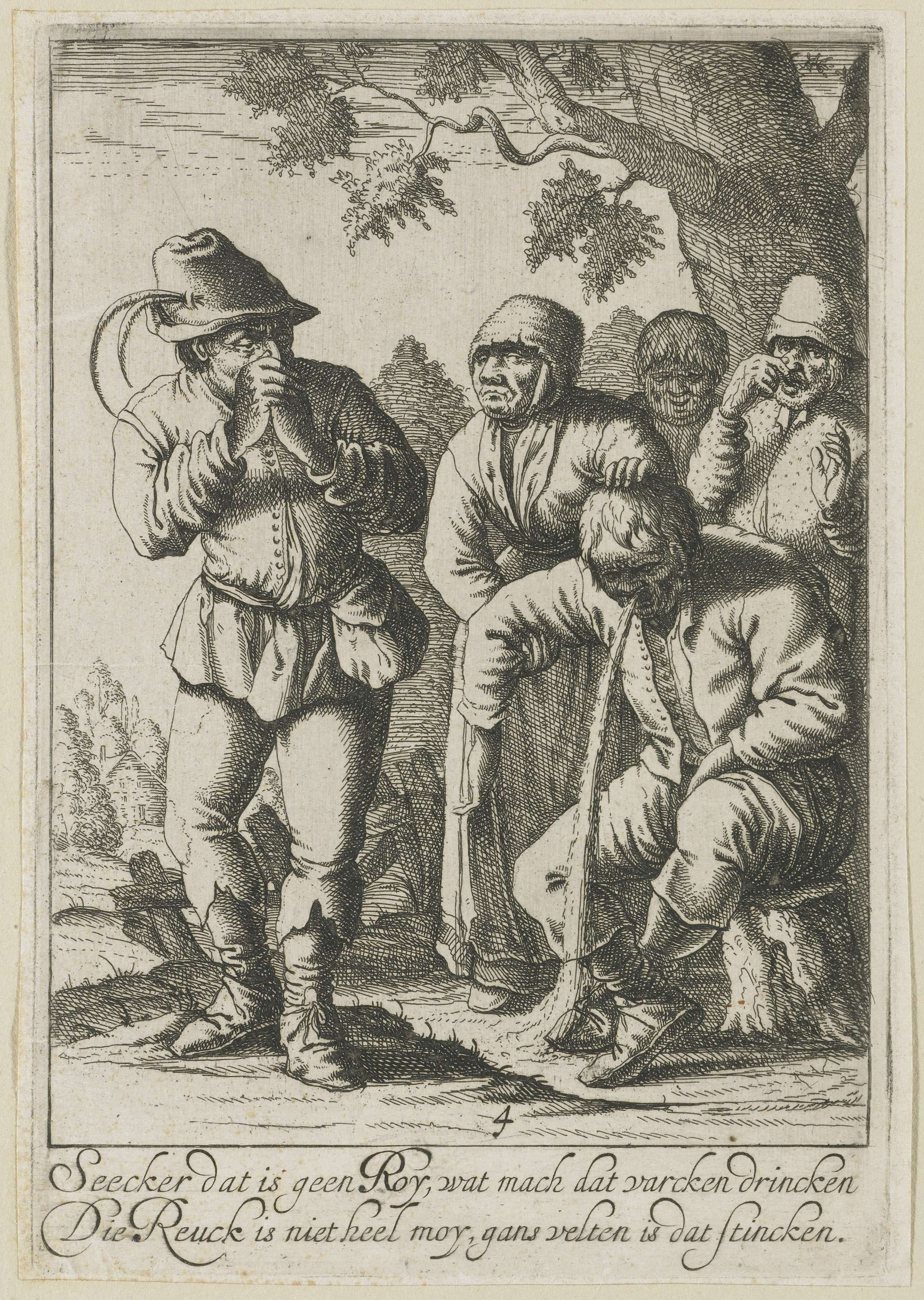 Een man geeft over. Twee mannen knijpen hun neus dicht, omdat de kots stinkt. Onder de voorstelling een tweeregelig vers in het Nederlands. De prent maakt deel uit van een serie van vijf prenten met de vijf zintuigen.