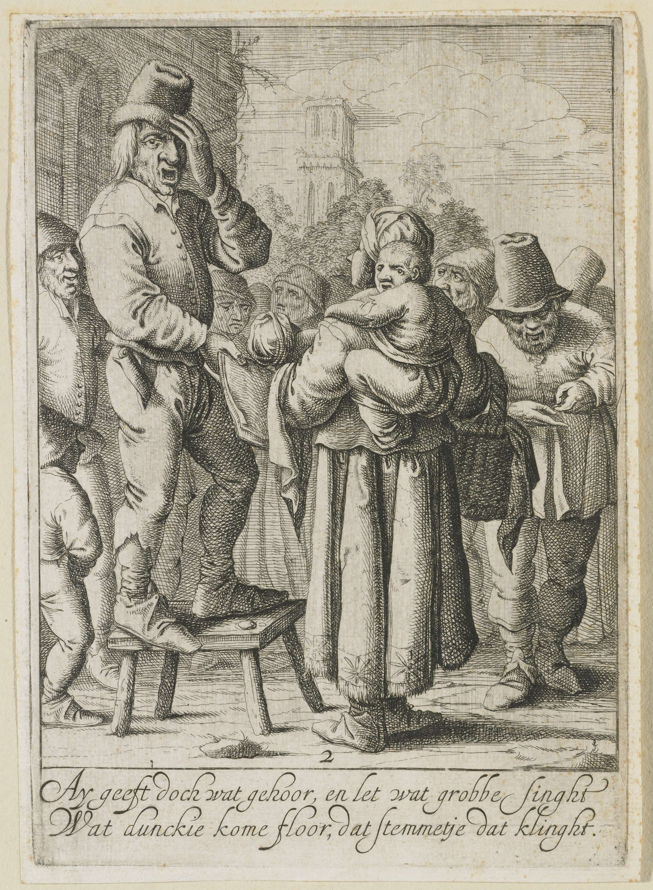 Een man staat op een kruk te zingen. Rondom hem staan toeschouwers. Onder de voorstelling een tweeregelig vers in het Nederlands. De prent maakt deel uit van een serie van vijf prenten met de vijf zintuigen.