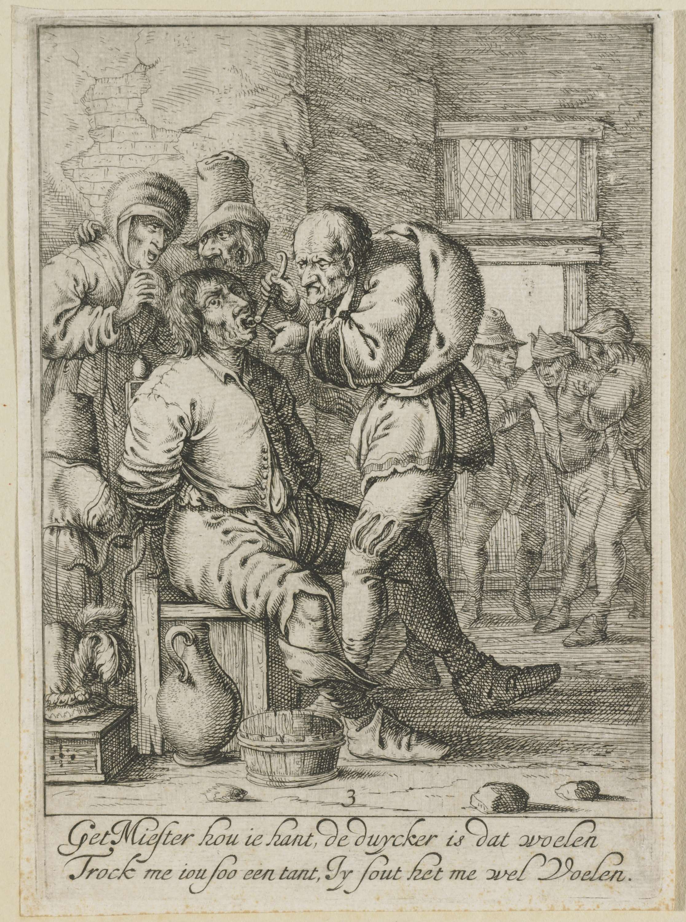 Een man zit vastgebonden aan een stoel, terwijl een man met een tang een van zijn tanden trekt. Onder de voorstelling een tweeregelig vers in het Nederlands. De prent maakt deel uit van een serie van vijf prenten met de vijf zintuigen.