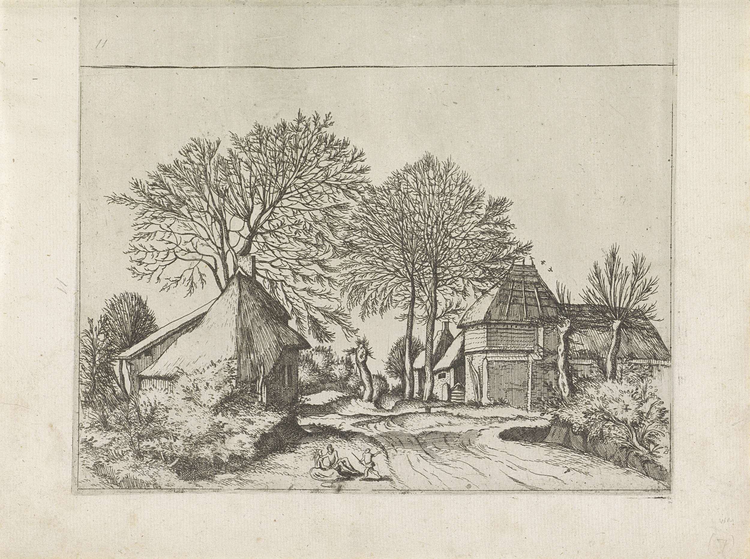 Een boerderij en een schuur langs een weg. Op de voorgrond een liefdespaar.