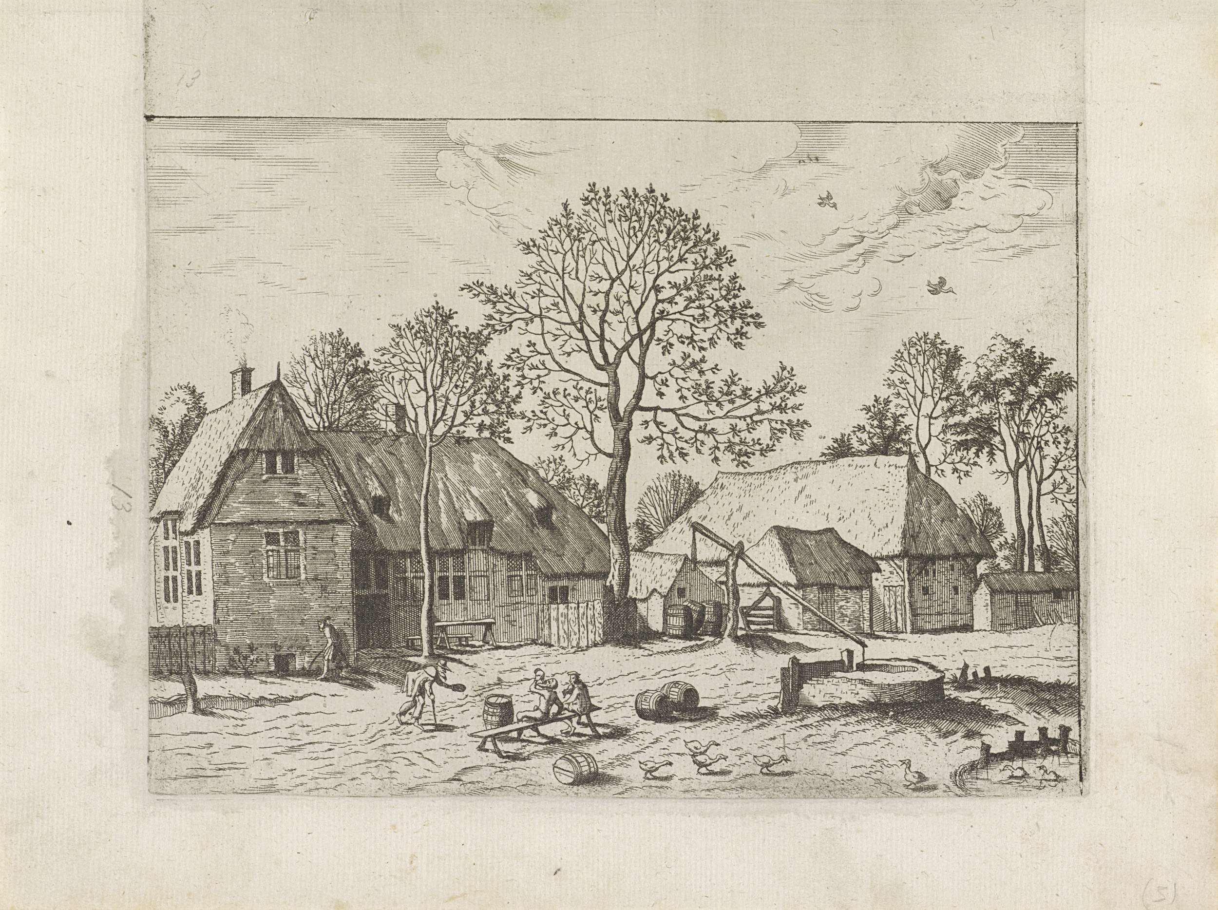 Twee boerderijen met een waterput op de voorgrond. Links twee boeren op een bankje.