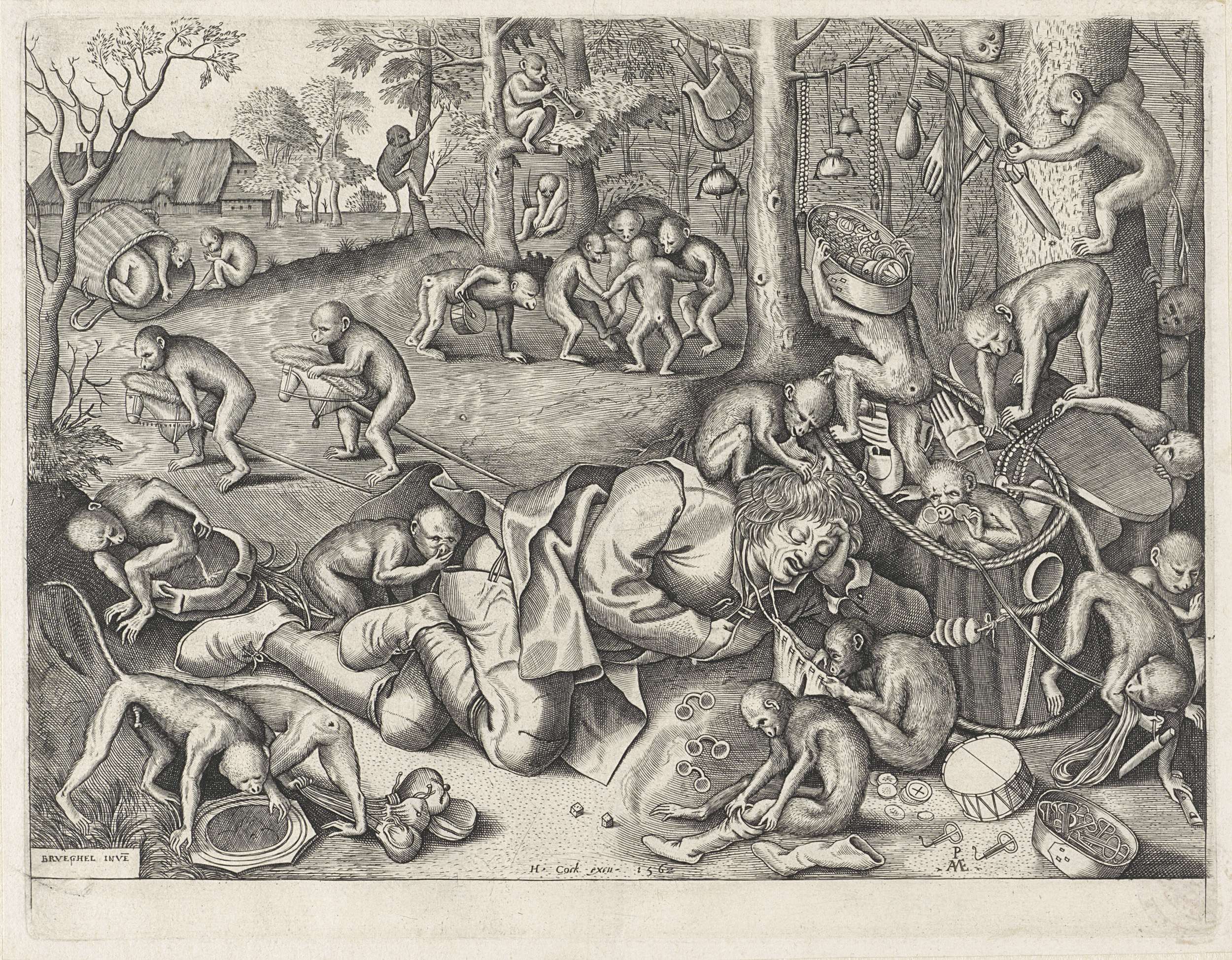 Een slapende koopman of marskramer wordt beroofd en bespot door apen. De apen hebben zijn mand met koopwaar opengemaakt en spelen met de inhoud. Een aap heeft de broek van de man losgemaakt en knijpt zijn neus dicht tegen de stank, een andere aap poept in zijn hoed. Op de achtergrond danst een groep apen, ...