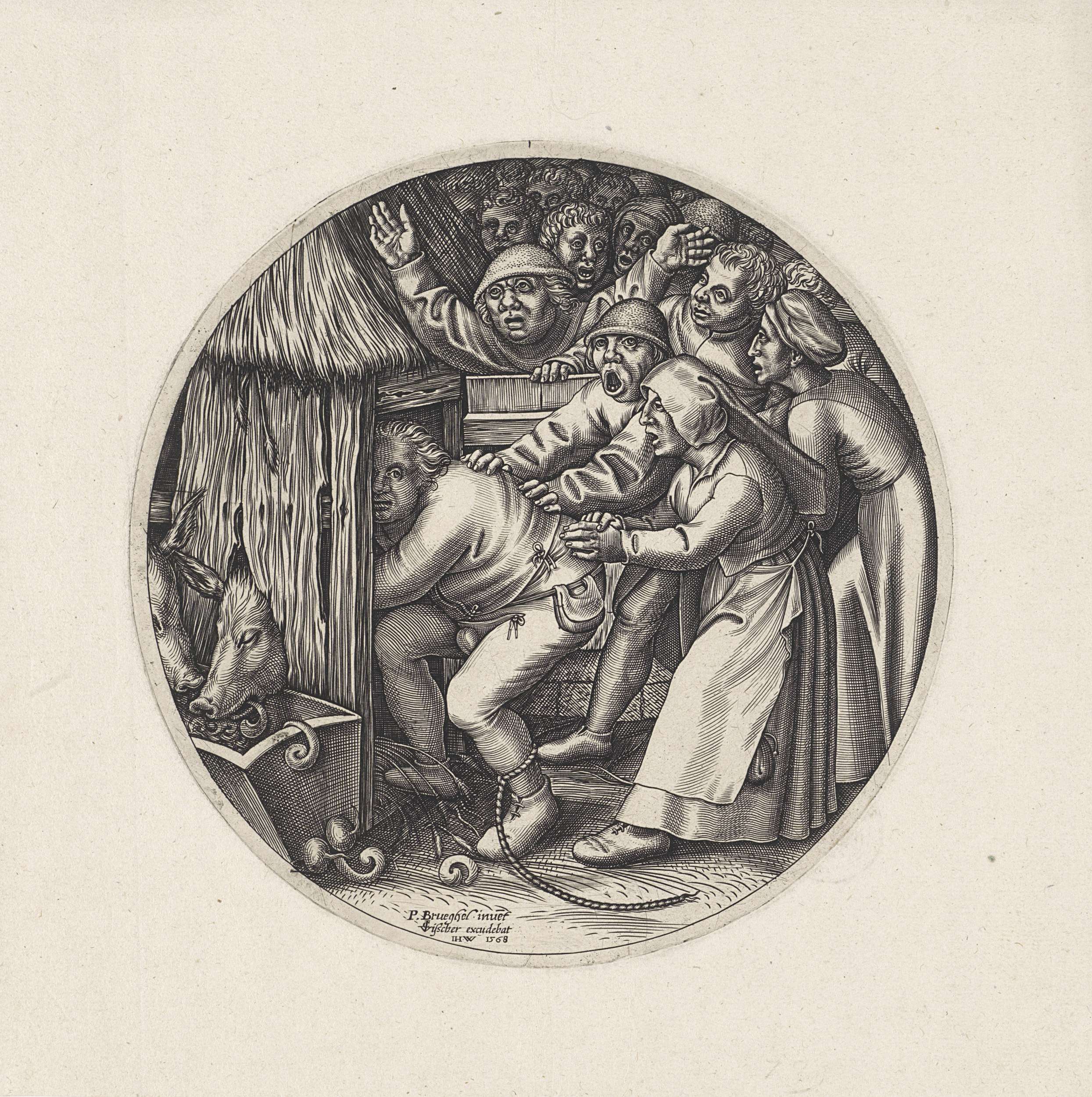 Als straf voor zijn dronkenschap wordt een boer (met een touw aan zijn enkel) door een groep mannen en vrouwen in een varkensstal geduwd.