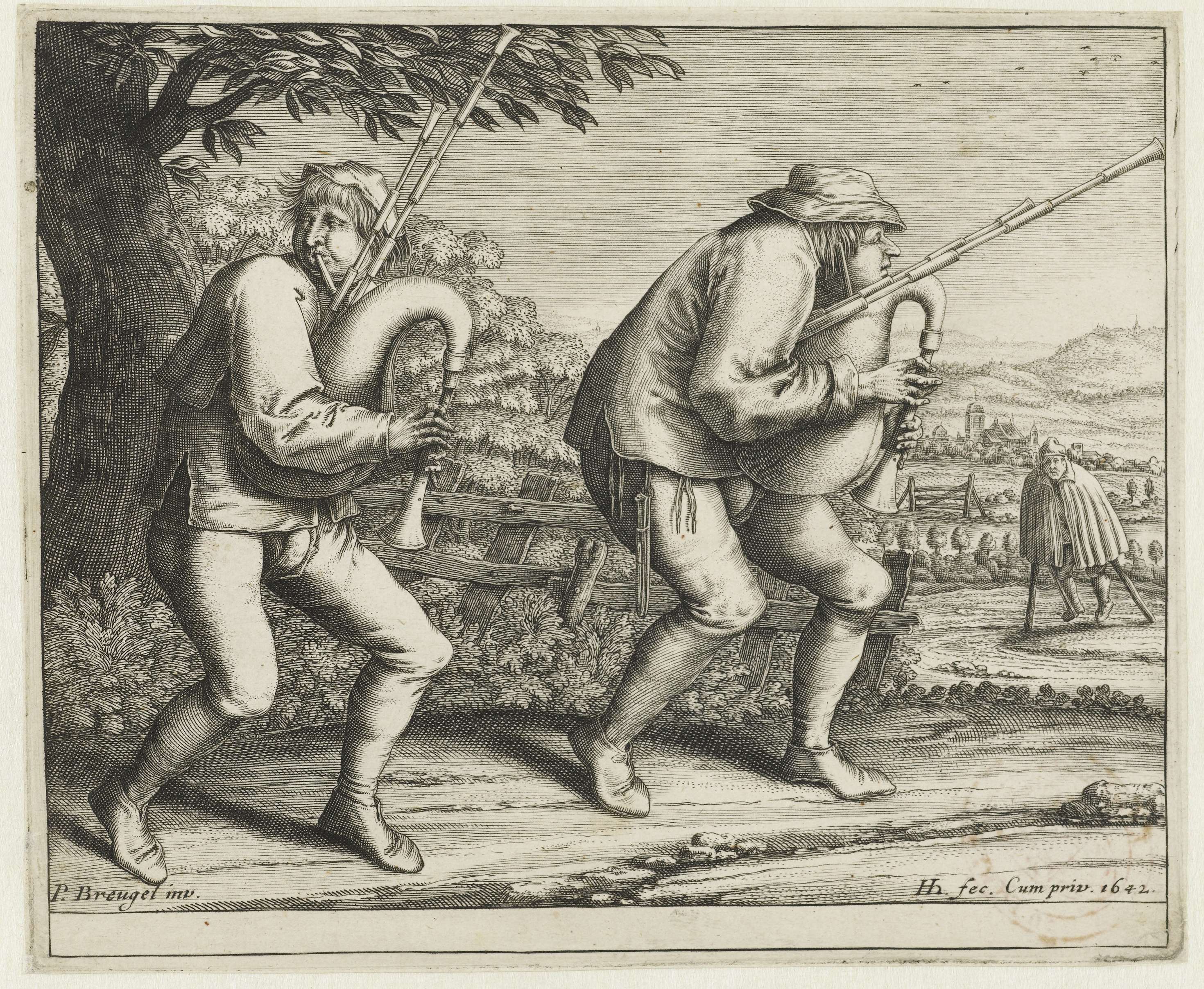 Twee doedelzakspelers lopen op een landweg. Op de achtergrond een man op krukken. Deze doedelzakspelers lopen voorop in de pelgrimstocht van epileptici op Sint Jansdag naar Molenbeek bij Brussel.