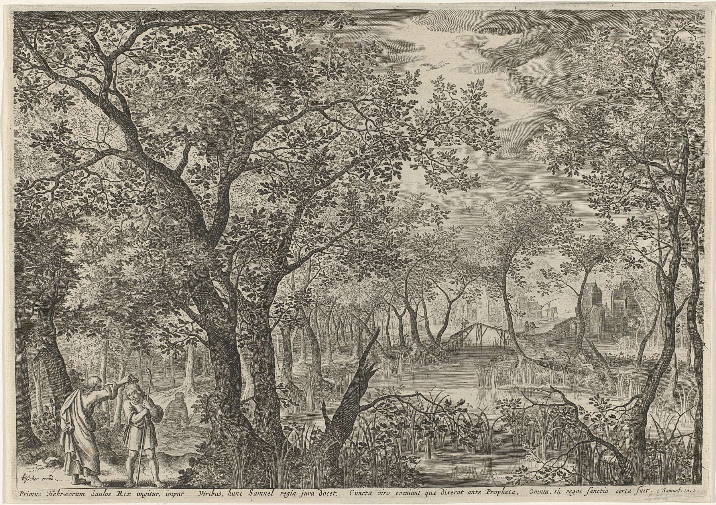 Waterrijk landschap waarin Saul door Samuël tot koning wordt gezalfd. Samuël leegt een kruikje olie boven het hoofd van Saul. Onder de voorstelling de titel in het Latijn en een verwijzing naar de Bijbeltekst in 1 Sam. 10:1.