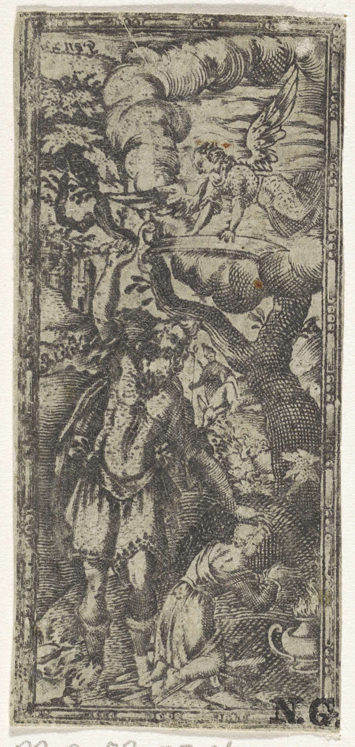 Abraham heft zijn zwaard om zijn zoon Isaak te offeren, maar een engel weerhoudt hem daarvan. In de linkerbovenhoek een verwijzing naar Gen. 22 in spiegelbeeld.