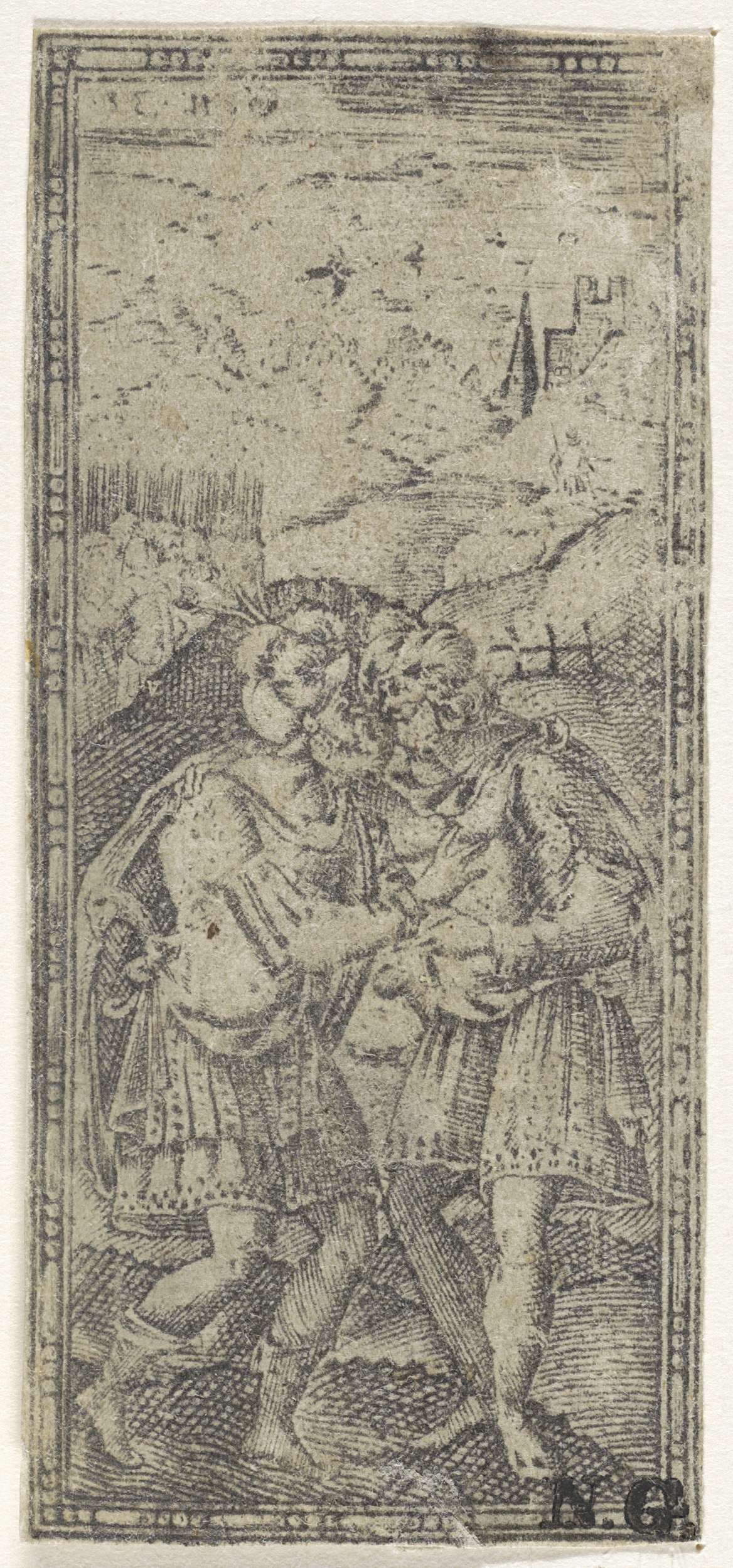 De broers Jakob en Esau omhelzen elkaar. Op de achtergrond een landschap. In de linkerbovenhoek een verwijzing naar Gen. 33 in spiegelbeeld.
