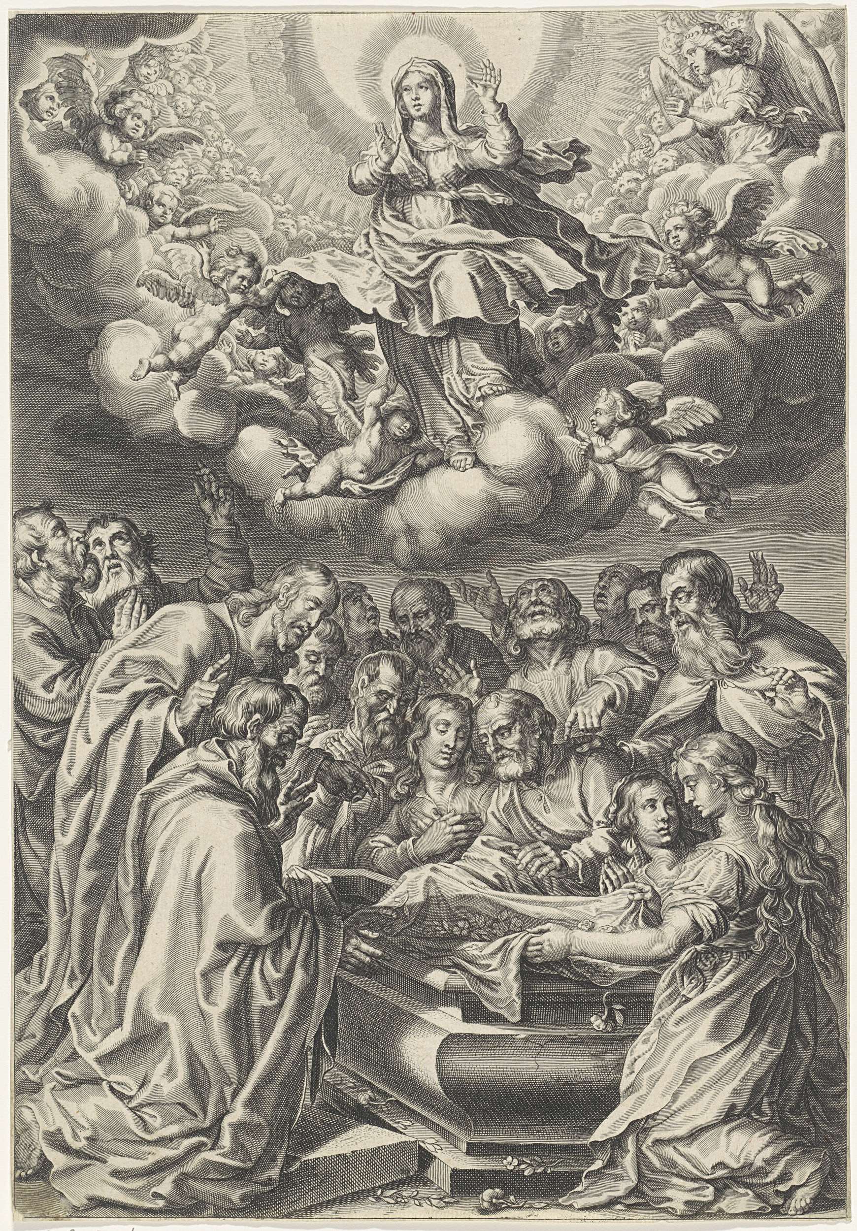 Maria vaart ten hemel staand op een wolk. Ze wordt omringd door engelen. De twaalf discipelen en anderen buigen zich verbaasd over het lege graf.