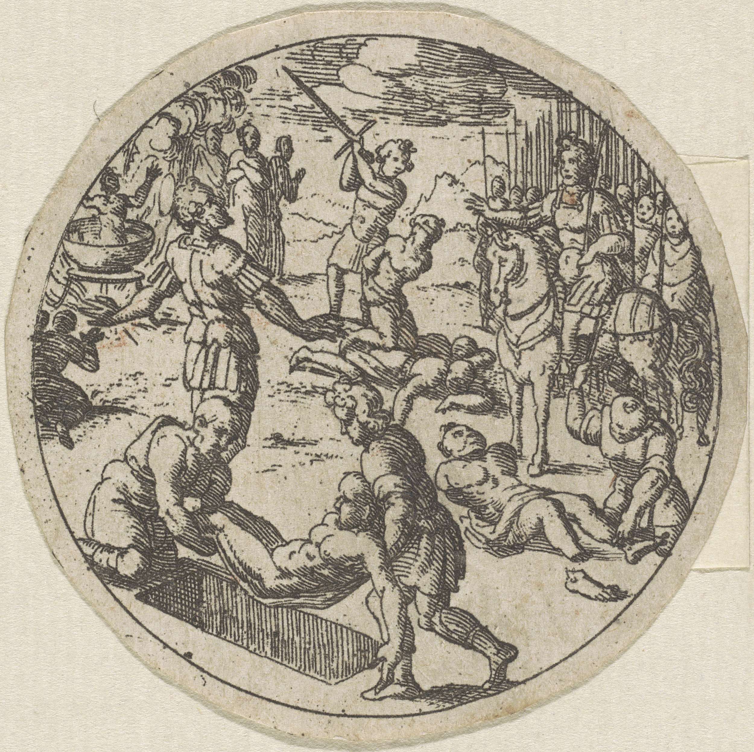 Een officier te paard geeft de opdracht om heiligen te doden. Op de achtergrond wordt iemand gekookt en wordt iemands hoofd afgeslagen. Op de voorgrond wordt iemand de voeten afgehakt en iemand wordt begraven.