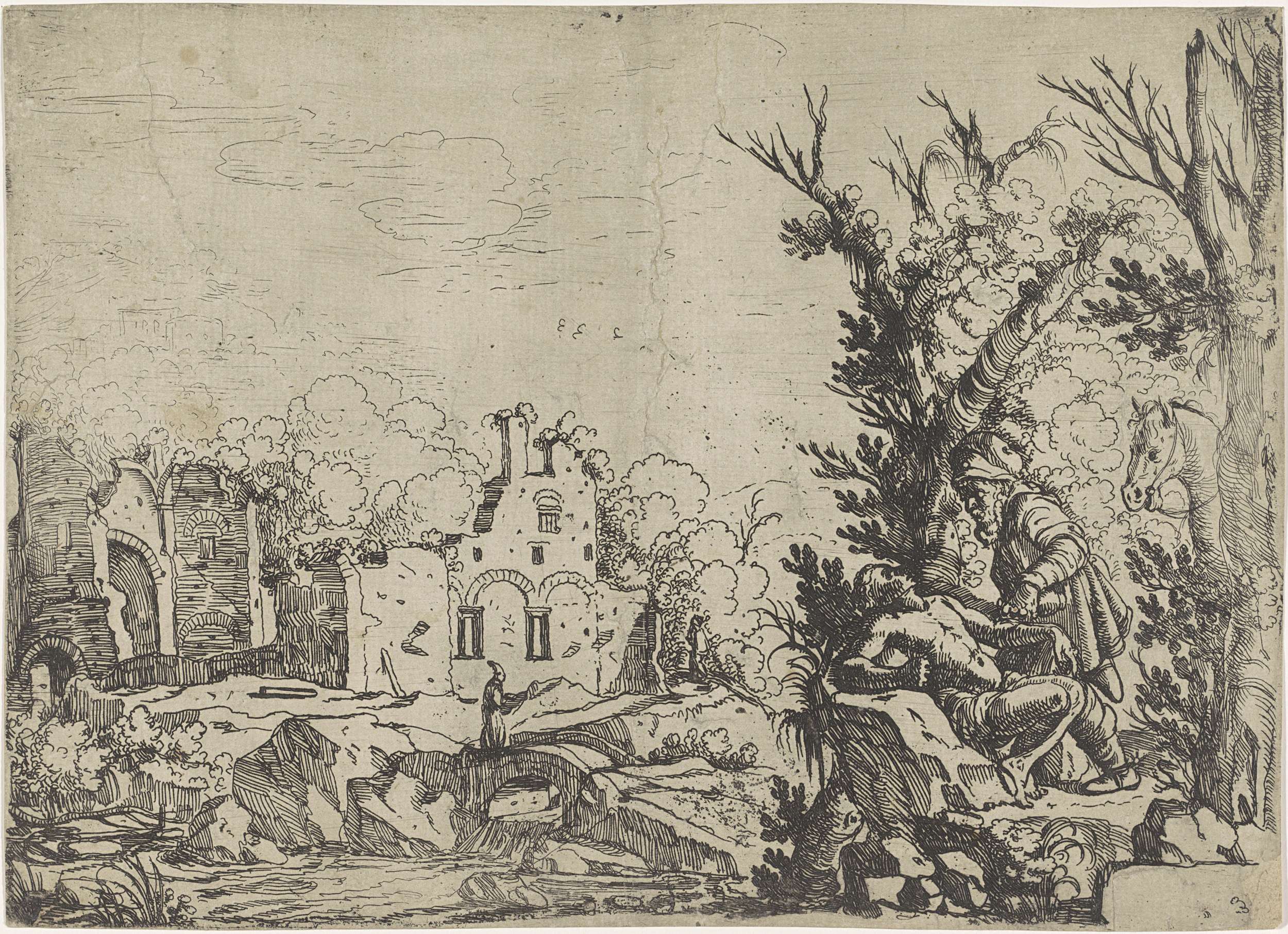 De barmhartige Samaritaan vindt de gewonde en beroofde man en verzorgt zijn wonden. In het landschap de twee voorbijgangers, die de gewonde man links lieten liggen.