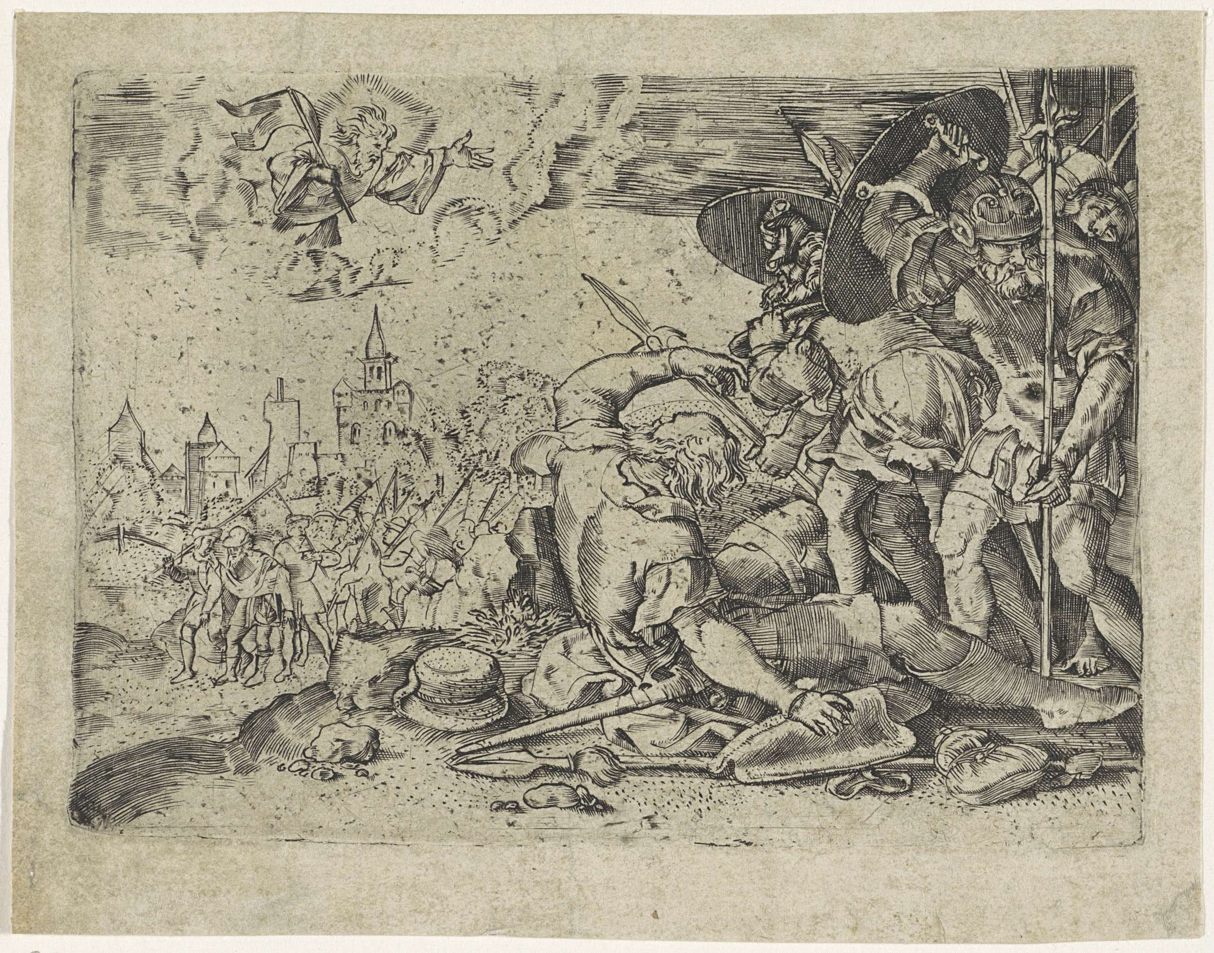 God de Vader of Christus verschijnt met een banier aan de hemel. Op de voorgrond een vallende man bij een groep soldaten. Naast hem liggen zijn hoed en zijn geldbeurs. Op de achtergrond een groep gewapende mannen en een stad.