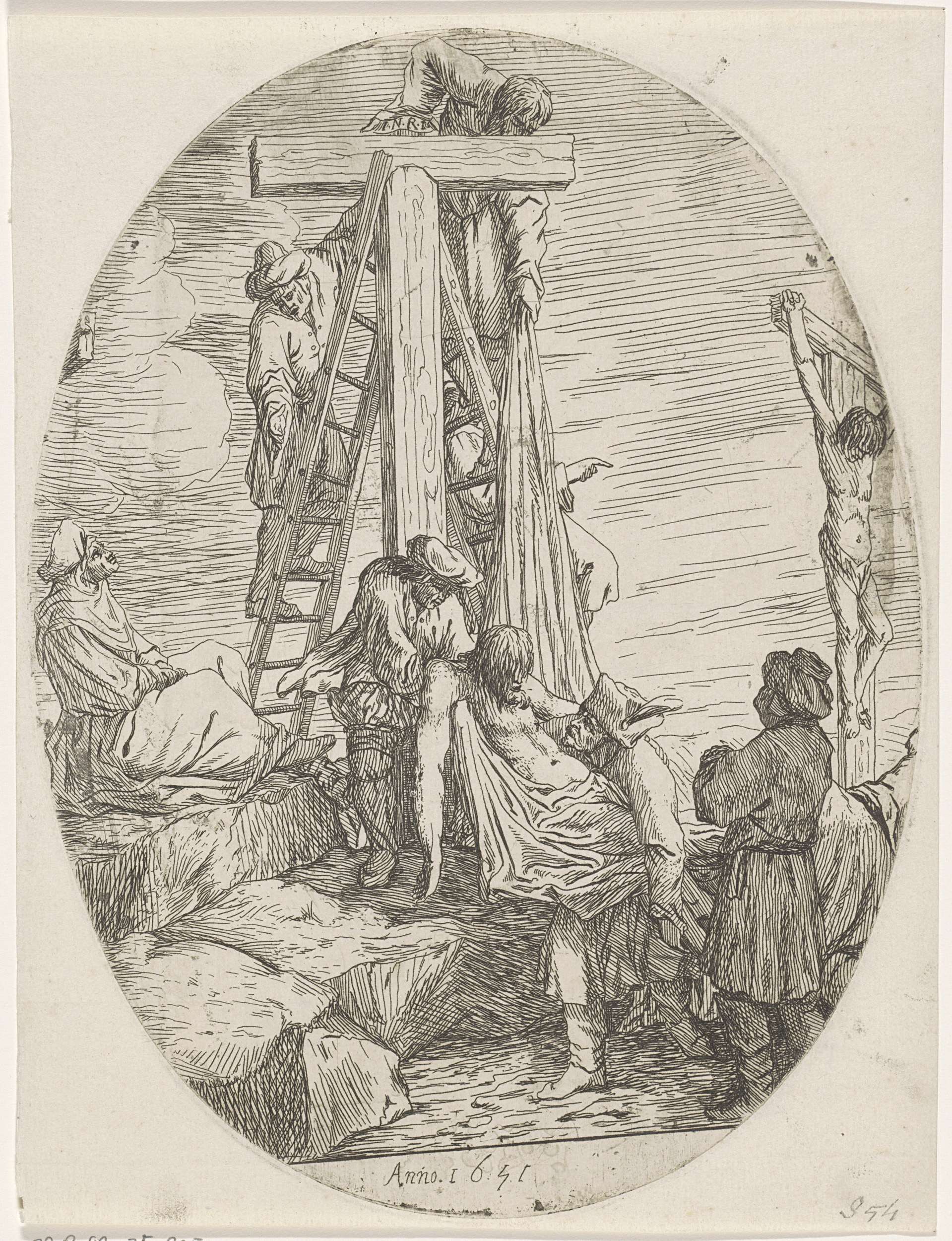 Nikodemus en Josef van Arimatea halen de gestorven Christus van het kruis.