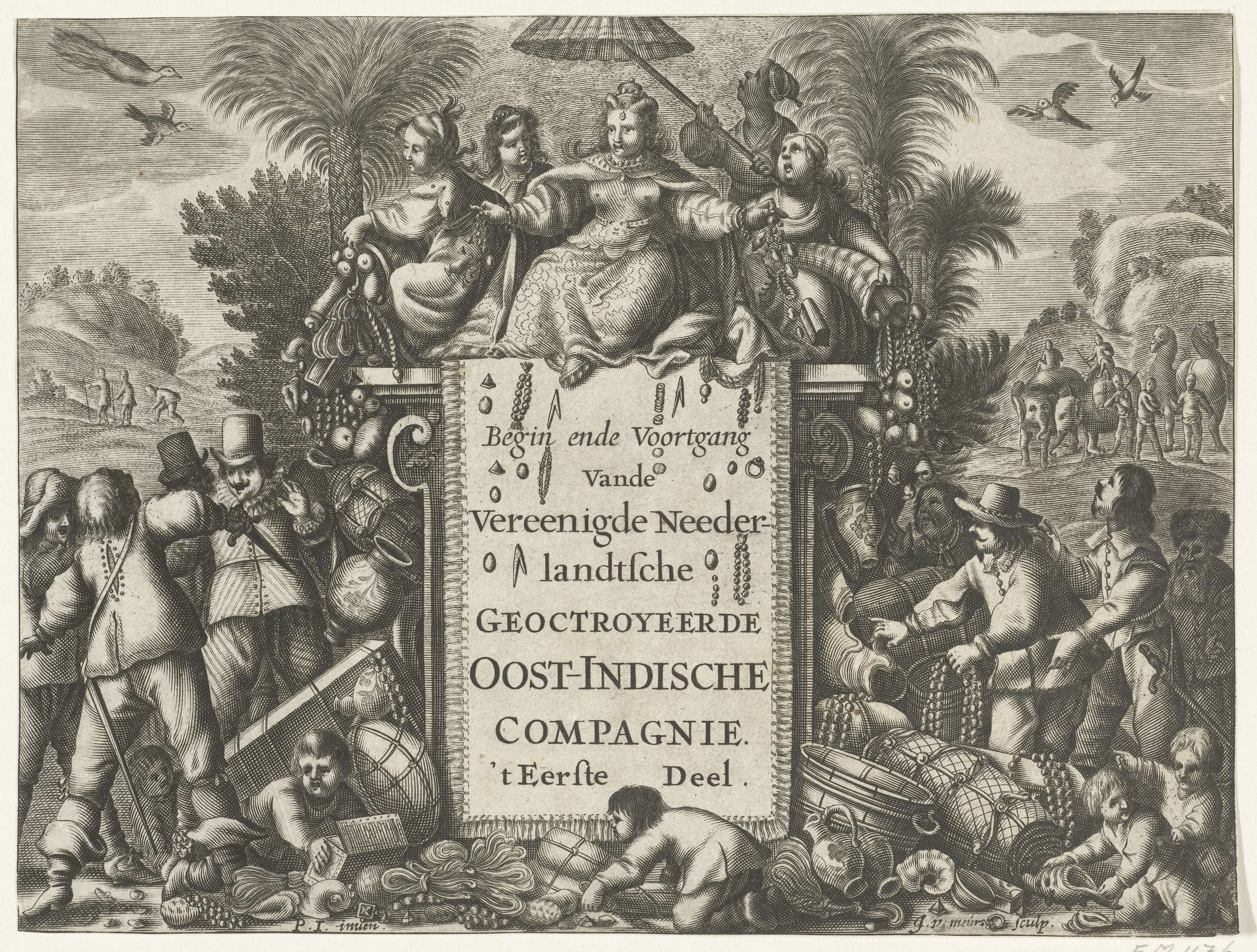Allegorische titelprent van het eerste deel van: I. Commelin, Begin ende voortgangh van de Vereenighde Nederlantsche Geoctroyeerde Oost-Indische Compagnie, 1646. Bovenop de cartouche met de Nederlandse titel zitten in een tropisch landschap een aantal vrouwelijke personificaties van de rijkdom die de VOC binnenbrengt. Het uitstorten van deze rijkdommen op de grond leidt tot gevechten tussen ...