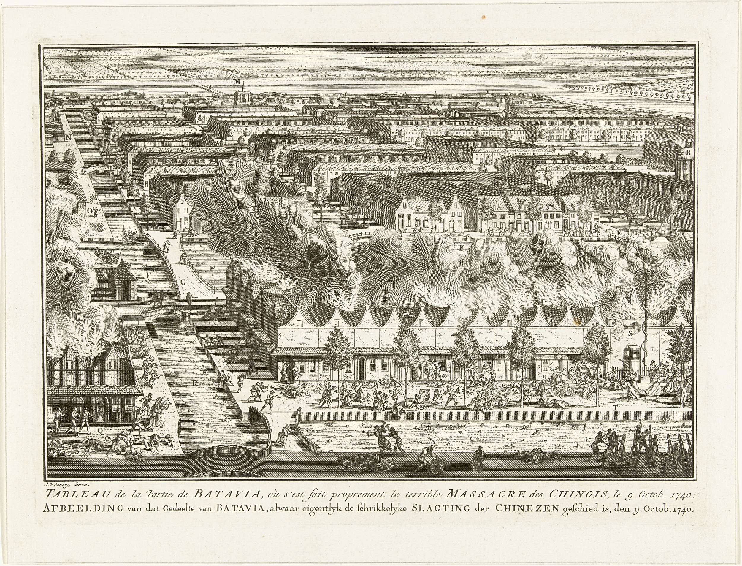 De massamoord op de Chinezen door de Nederlanders in de Chinese wijk van Batavia, na de ontdekking van het vermeende verraad, 9 oktober 1740. De straten en grachten liggen vol met de lichamen van vermoorde Chinezen. Op de voorgrond staat het Chinese huizenblok in brand, rechts de beschieting met kanonnen van het huis van de ...
