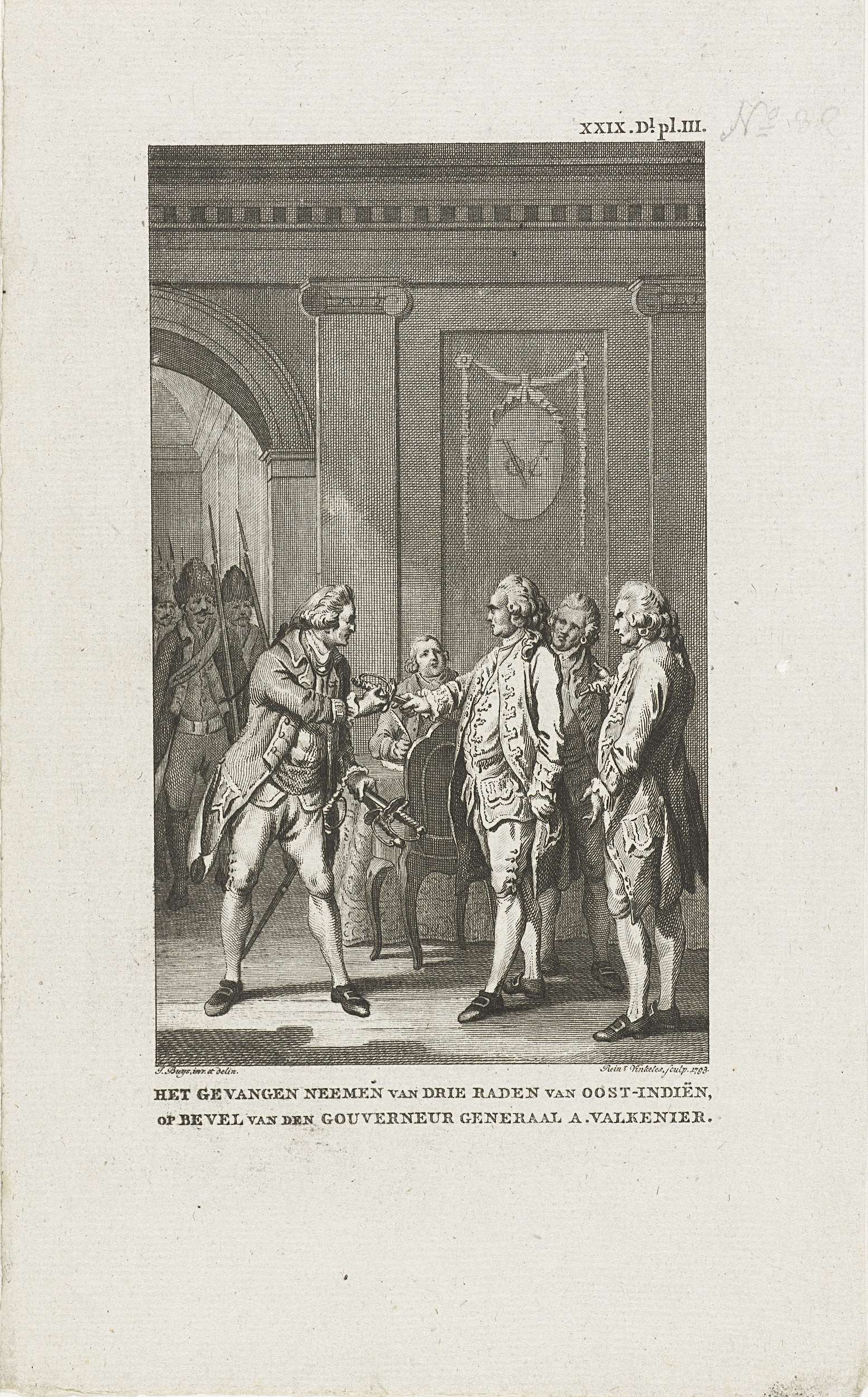De gevangenneming van drie leden van de Raad van Indie in Batavia Gustaaf Willem van Imhoff, Isaac van Schinne en Elias Haese op bevel van de gouverneur-generaal Adriaan Valkenier, december 1740. Gemerkt rechtsboven: XXIX. Dl. pl. III.