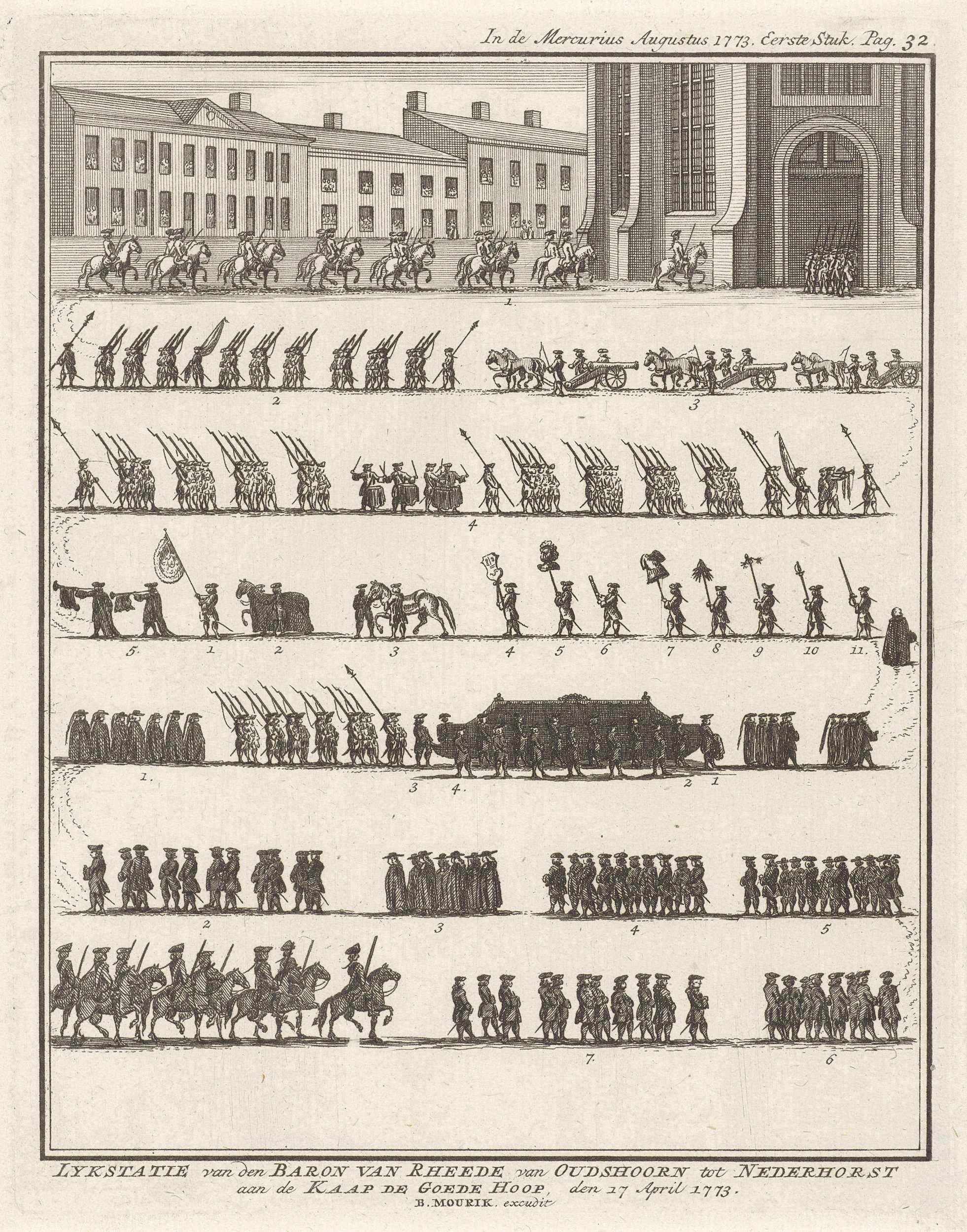 Lijkstatie van Pieter baron van Rheede van Outshoorn tot Nederhorst. Overleden 23 januari 1773 aan boord van het VOC-schip Asia, begraven op 17 april 1773 in de kerk van Kaap de Goede Hoop. De begrafenisstoet slingert in zeven banen naar de ingang van de kerk.