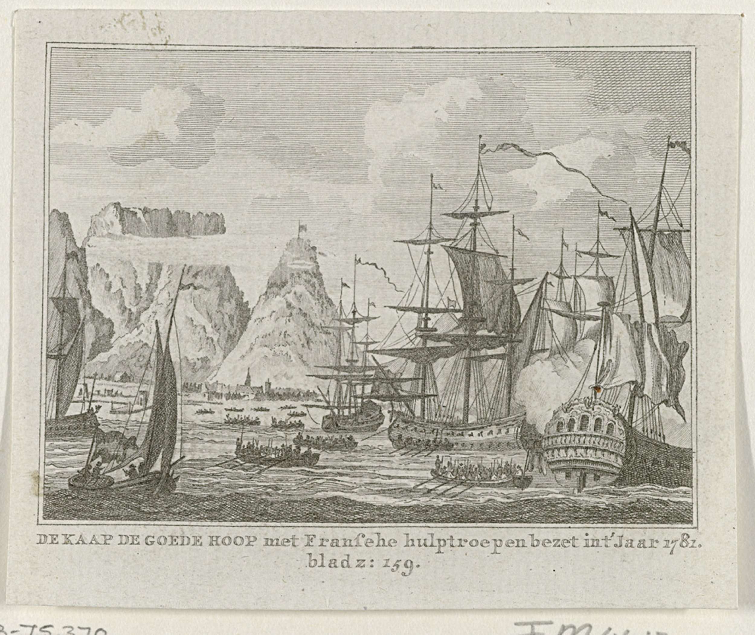 De bezetting van Kaap de Goede Hoop met steun van Franse hulptroepen, 21 juni 1781. Vloot en sloepen met manschappen met de stad op de achtergrond.