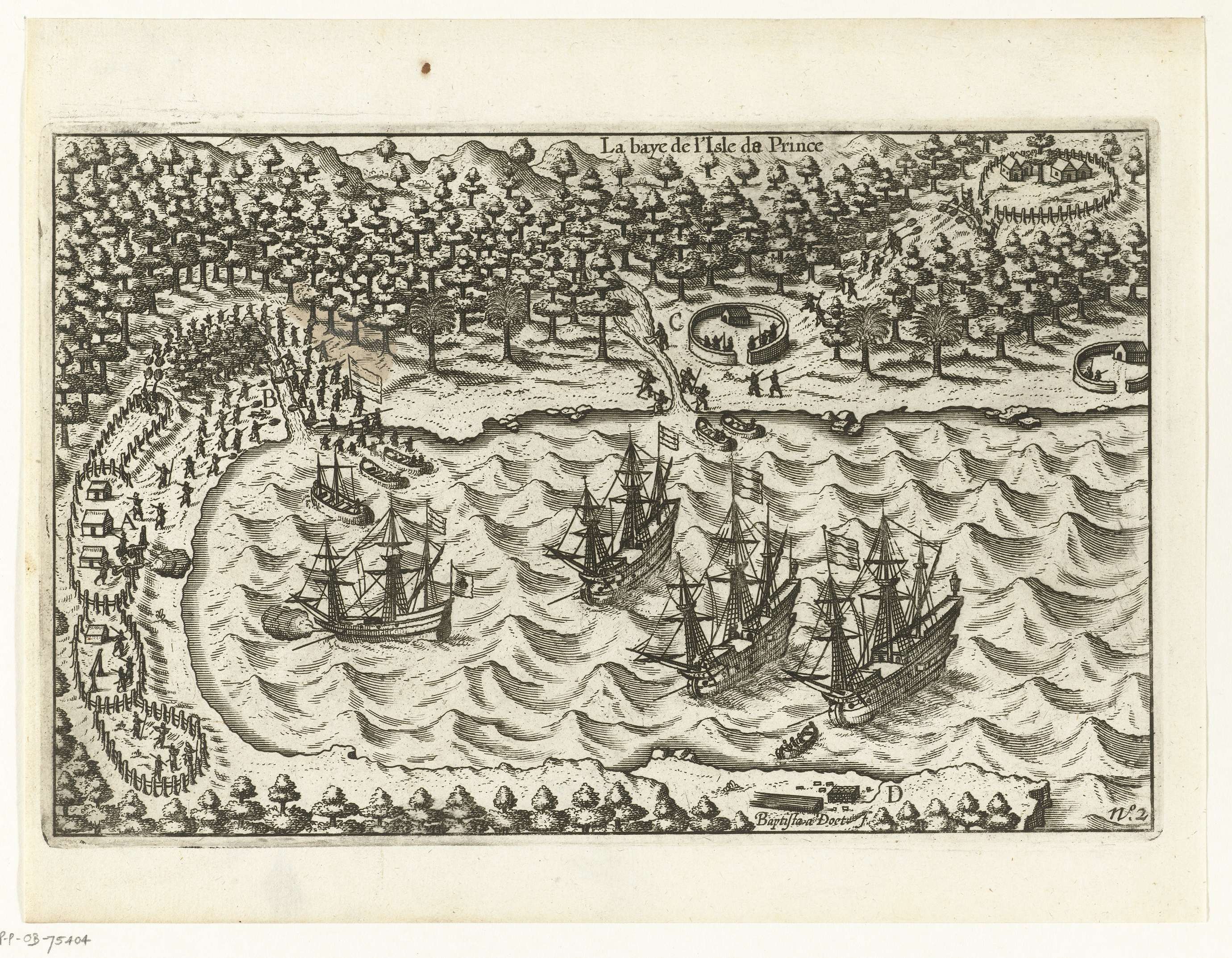 Beschieting van Portugezen door de schepen en gevechten op het eiland van Principe, 12 december. De vier schepen in de baai: De Mauritius, De Frederik Hendrik, De Eendracht en De Hoop. Onderdeel van de illustraties in het verslag van de reis om de wereld door Olivier van Noort in 1598-1601. No. 2.
