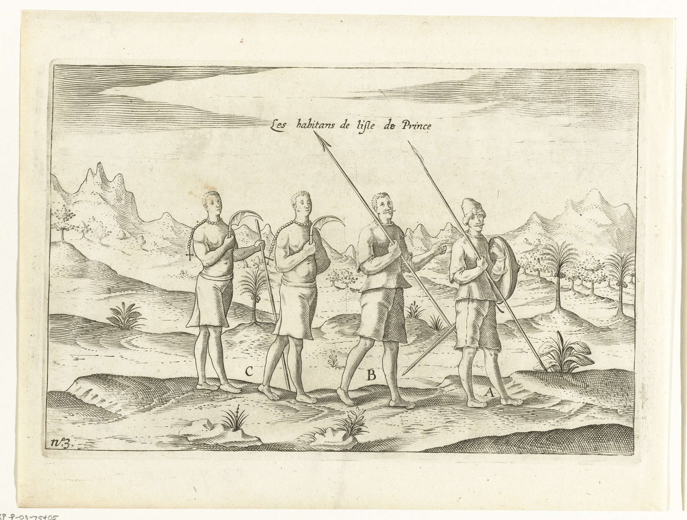 Twee mannen twee vrouwen, inwoners van het eiland Principe, 1598. Onderdeel van de illustraties in het verslag van de reis om de wereld door Olivier van Noort in 1598-1601. No. 3.